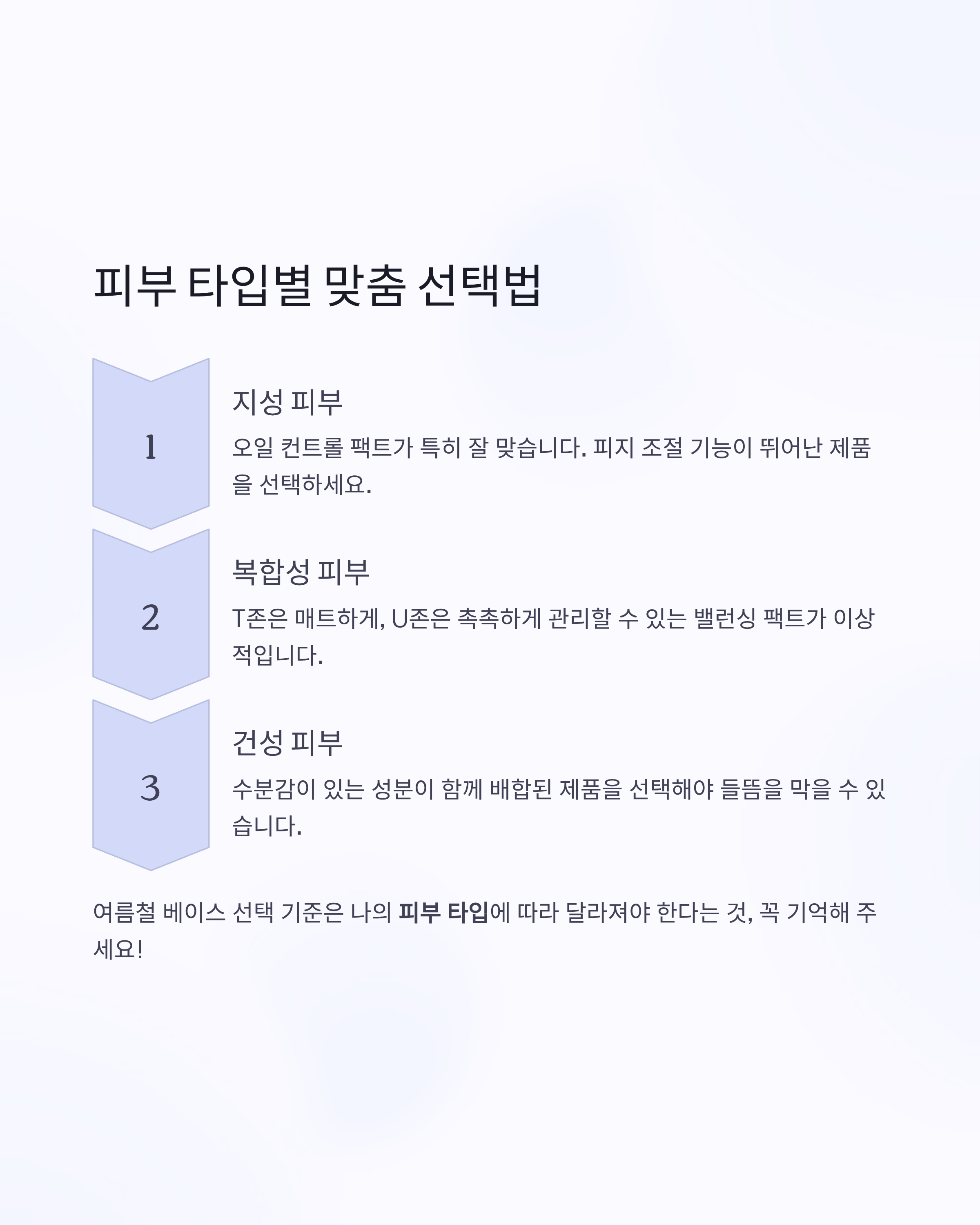 여름철 베이스 선택 기준은 나의 피부 타입에 따라 달라져야 한다는 것, 꼭 기억해 주세요.