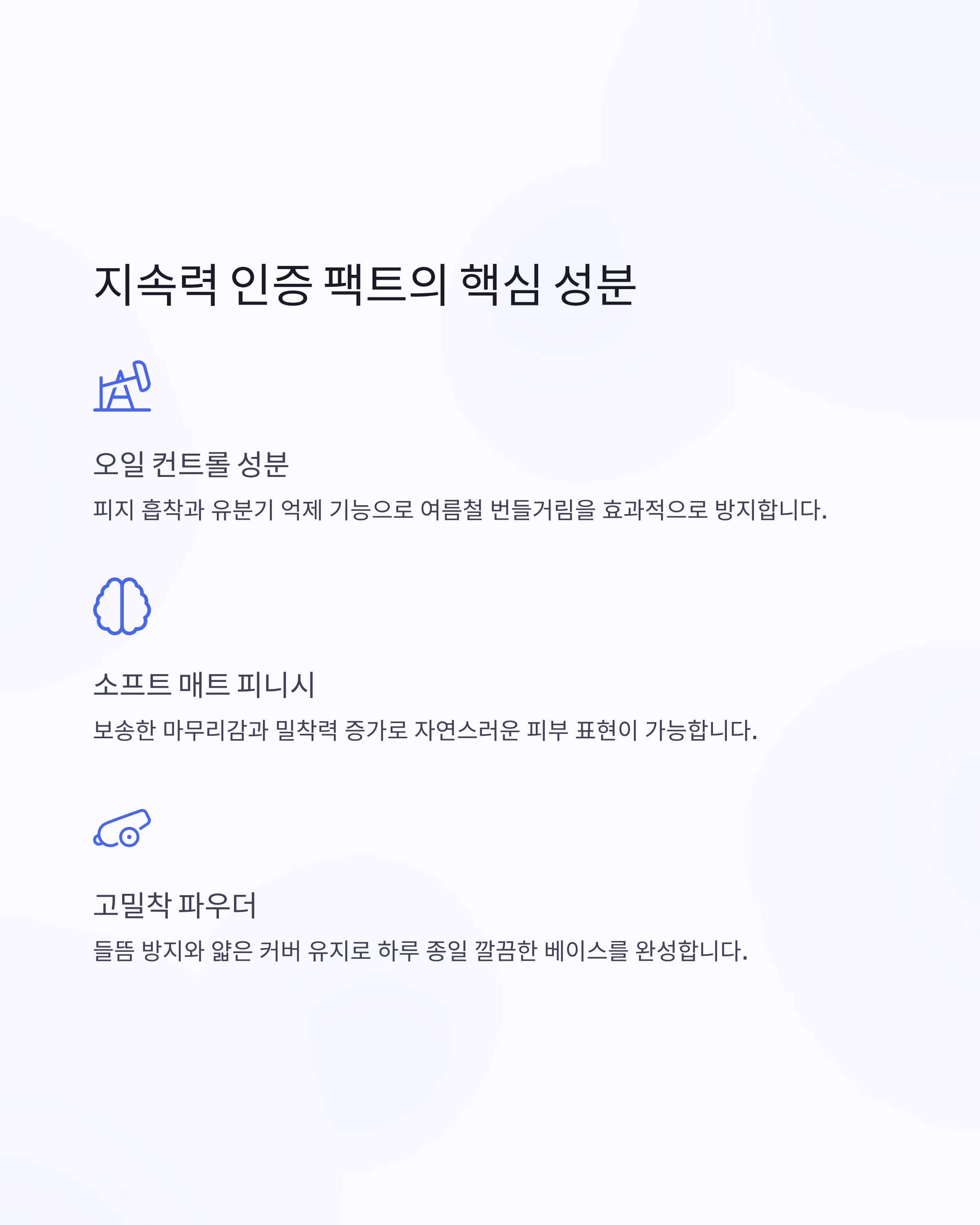 | 고밀착 파우더 | 들뜸 방지, 얇은 커버 유지 |