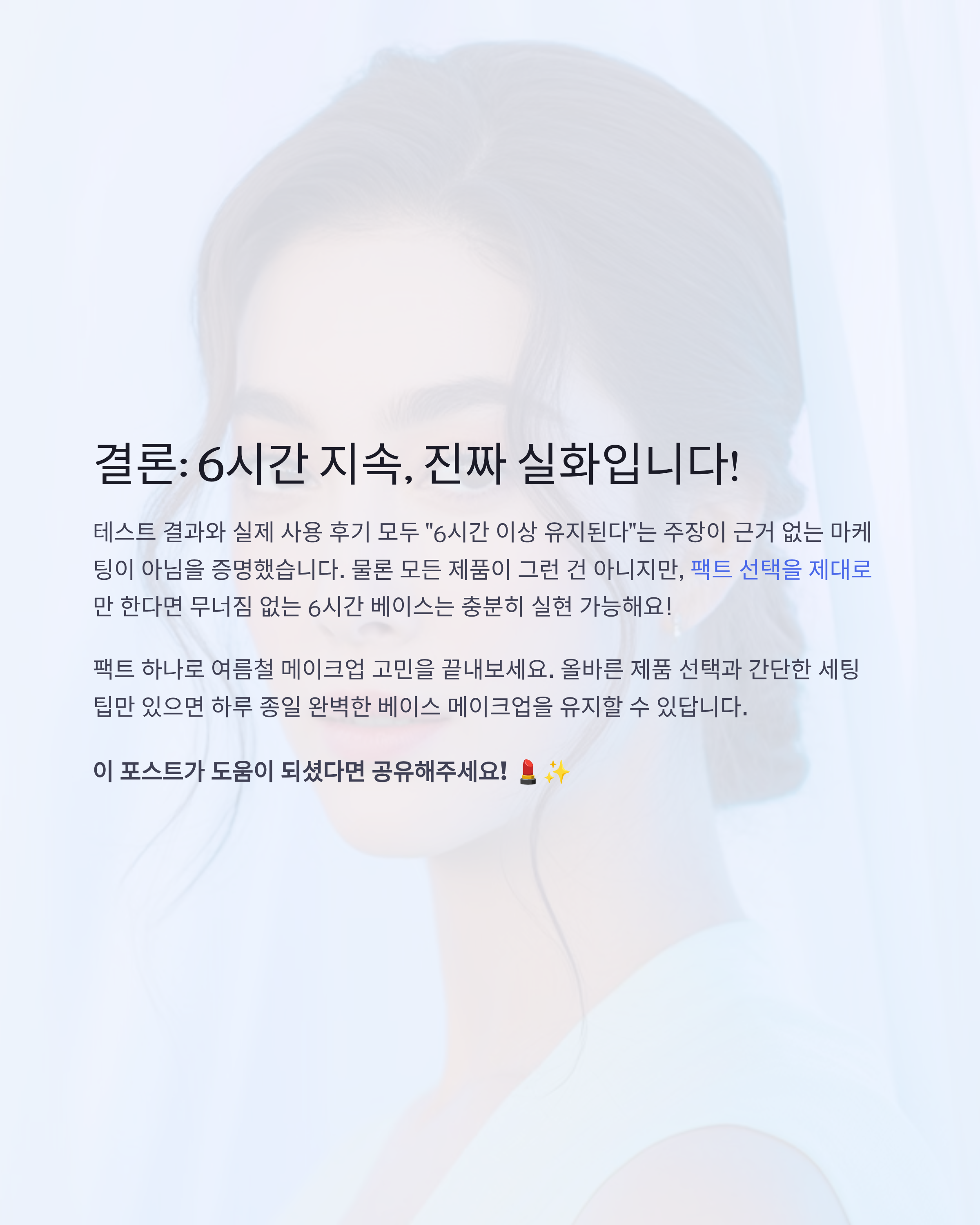 실제 테스트에서도 유분을 잡아주는 기능이 있는 팩트들은 평균 5~6시간 이상 베이스를 유지해주었고, 더운 실외 환경에서도 크게 무너짐 없이 마스크 묻어남도 줄어든 결과를 보여줬습니다.