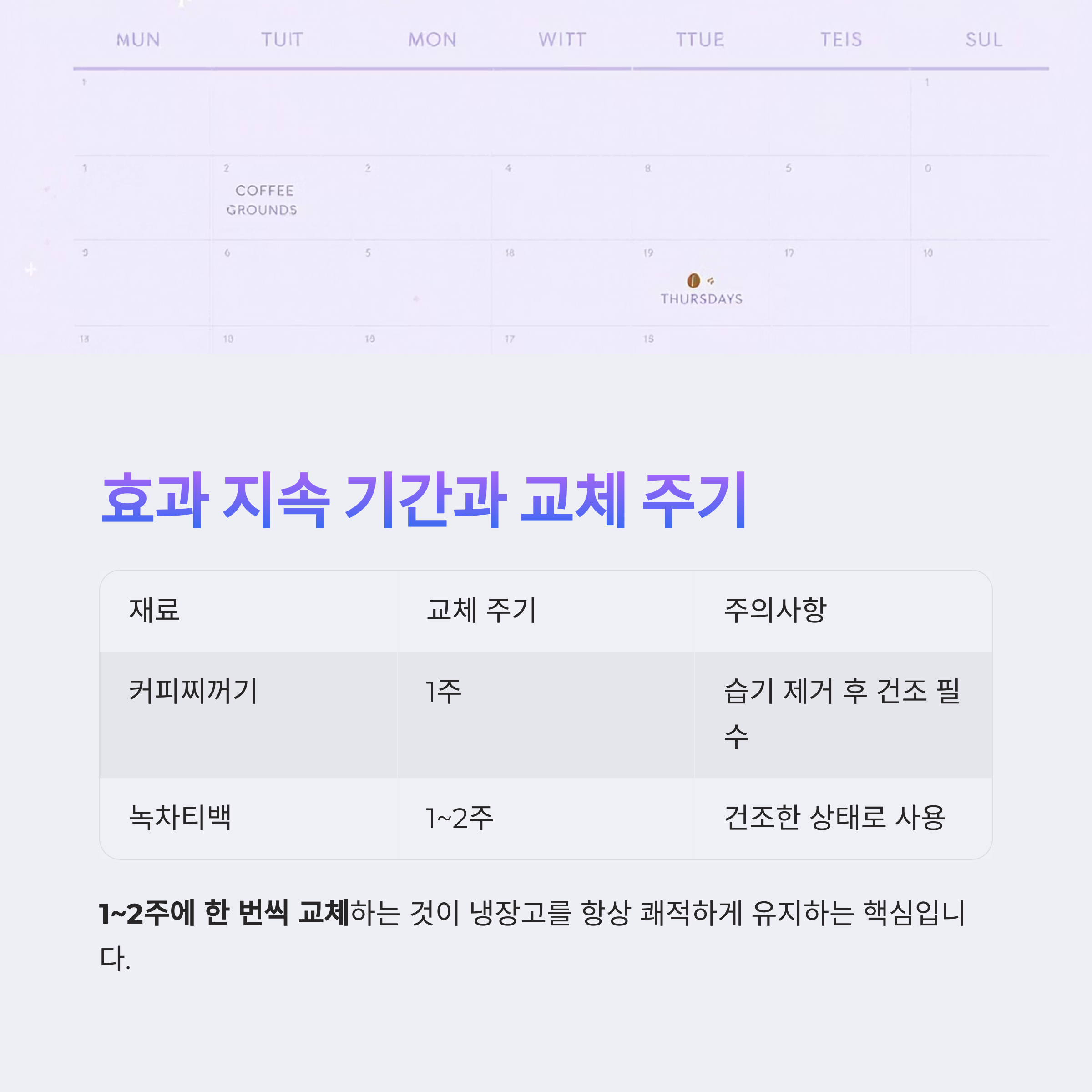 1~2주에 한 번씩 교체해주는 것이 냉장고를 항상 쾌적하게 유지하는 핵심입니다