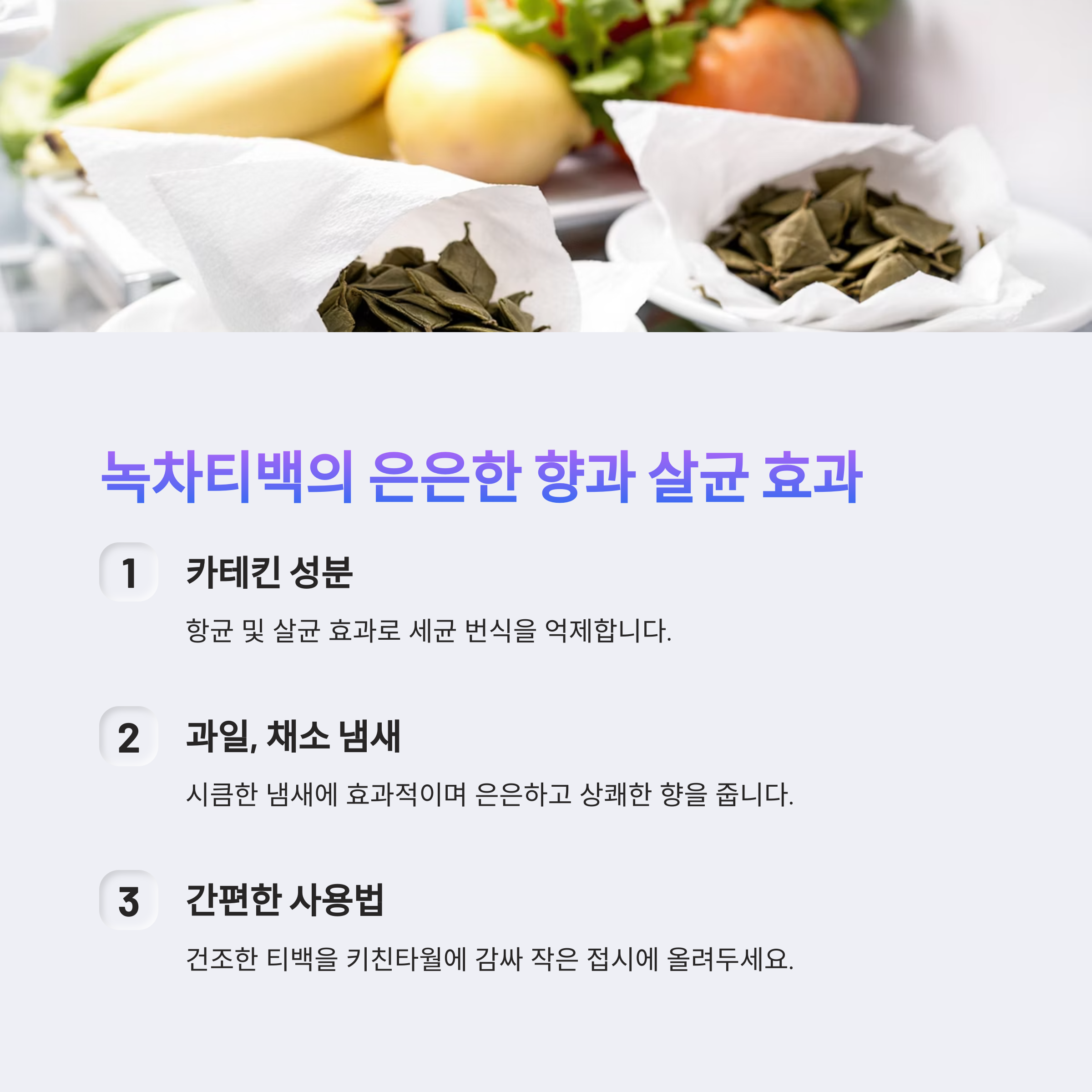 | 과일/야채 냄새 | 녹차티백 | 은은한 향과 살균 효과 |