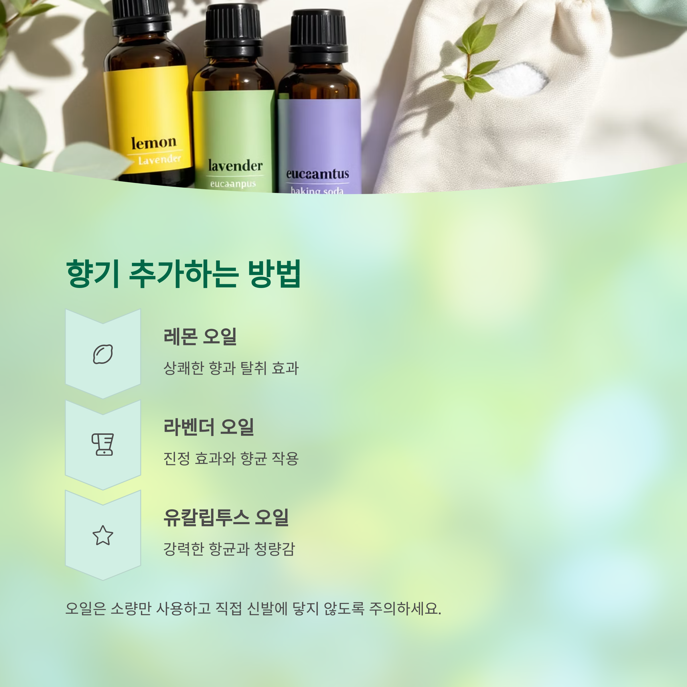 | 라벤더 오일 | 향균, 방향 | 베이킹소다에 몇 방울 섞기 |