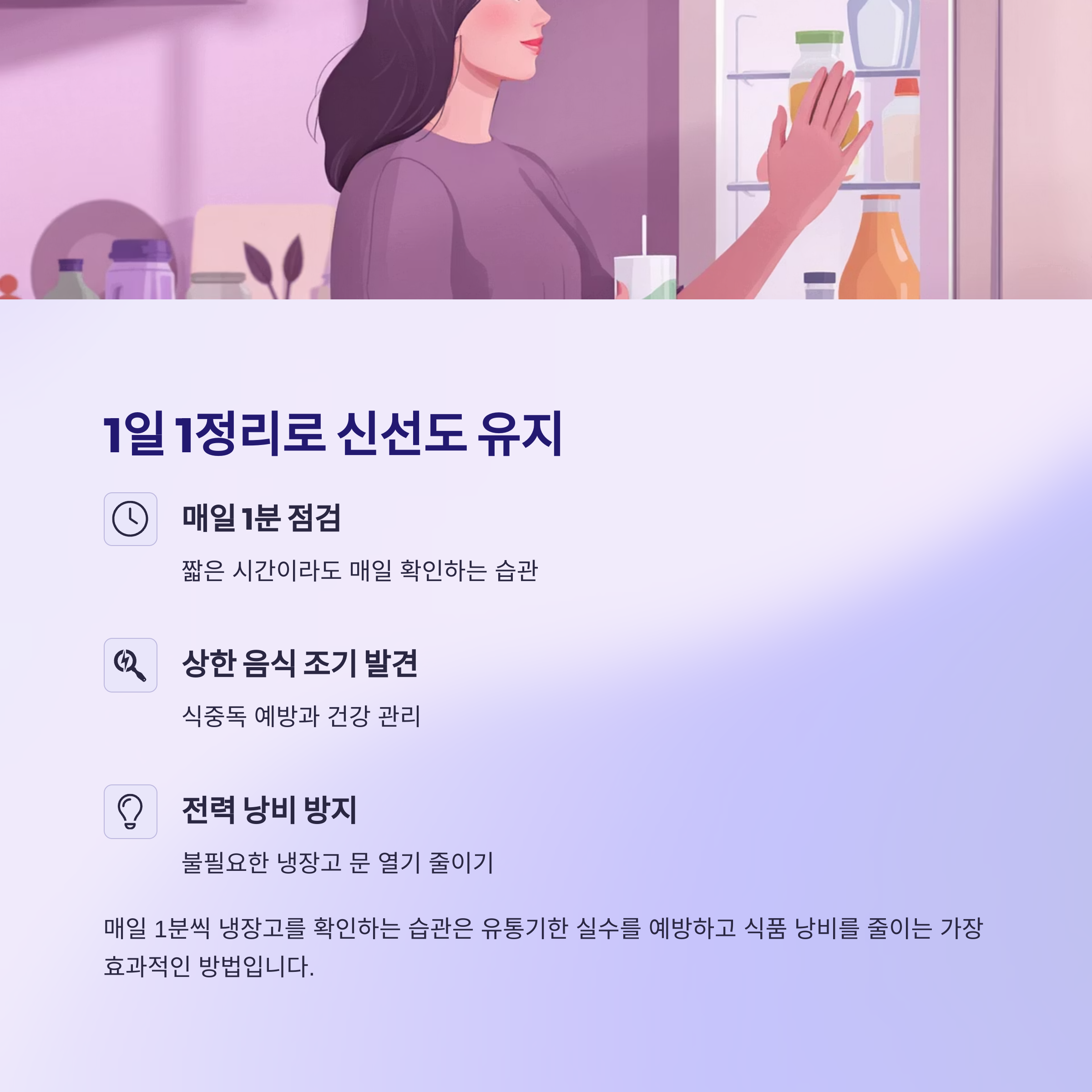 매일 1분씩 냉장고 안을 들여다보는 습관은 유통기한 실수 예방에 효과적입니다