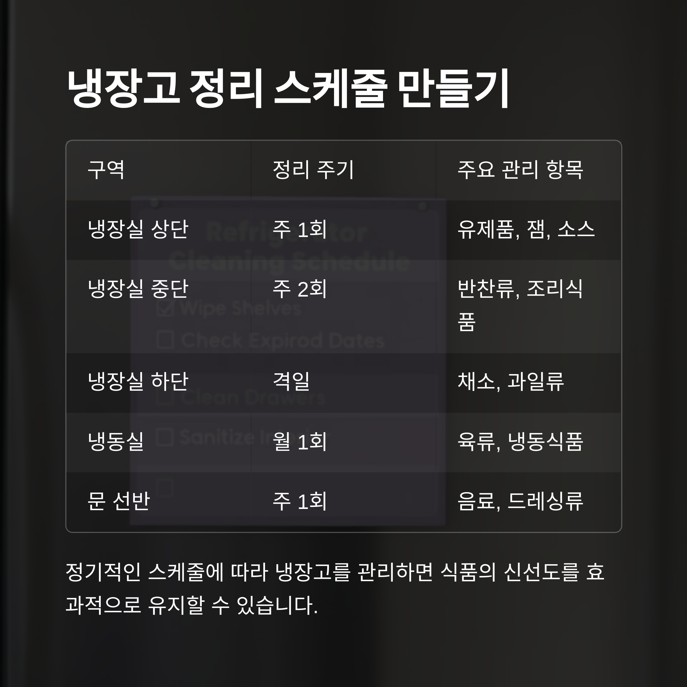 다음 표는 냉장고 정리 주기와 관리 포인트를 정리한 예시입니다