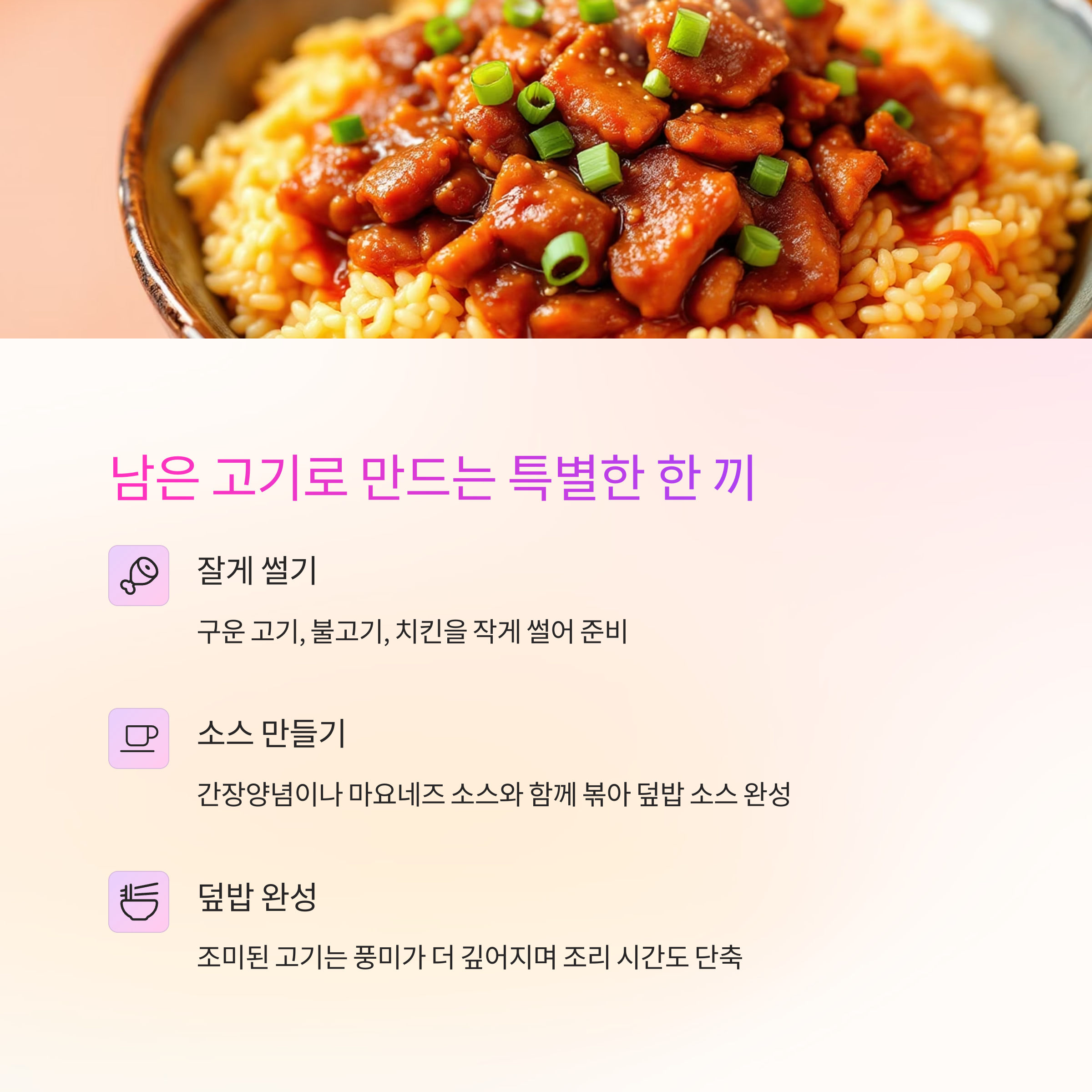 | 고기 | 덮밥, 볶음 | 조리된 고기는 간편 사용 가능 |