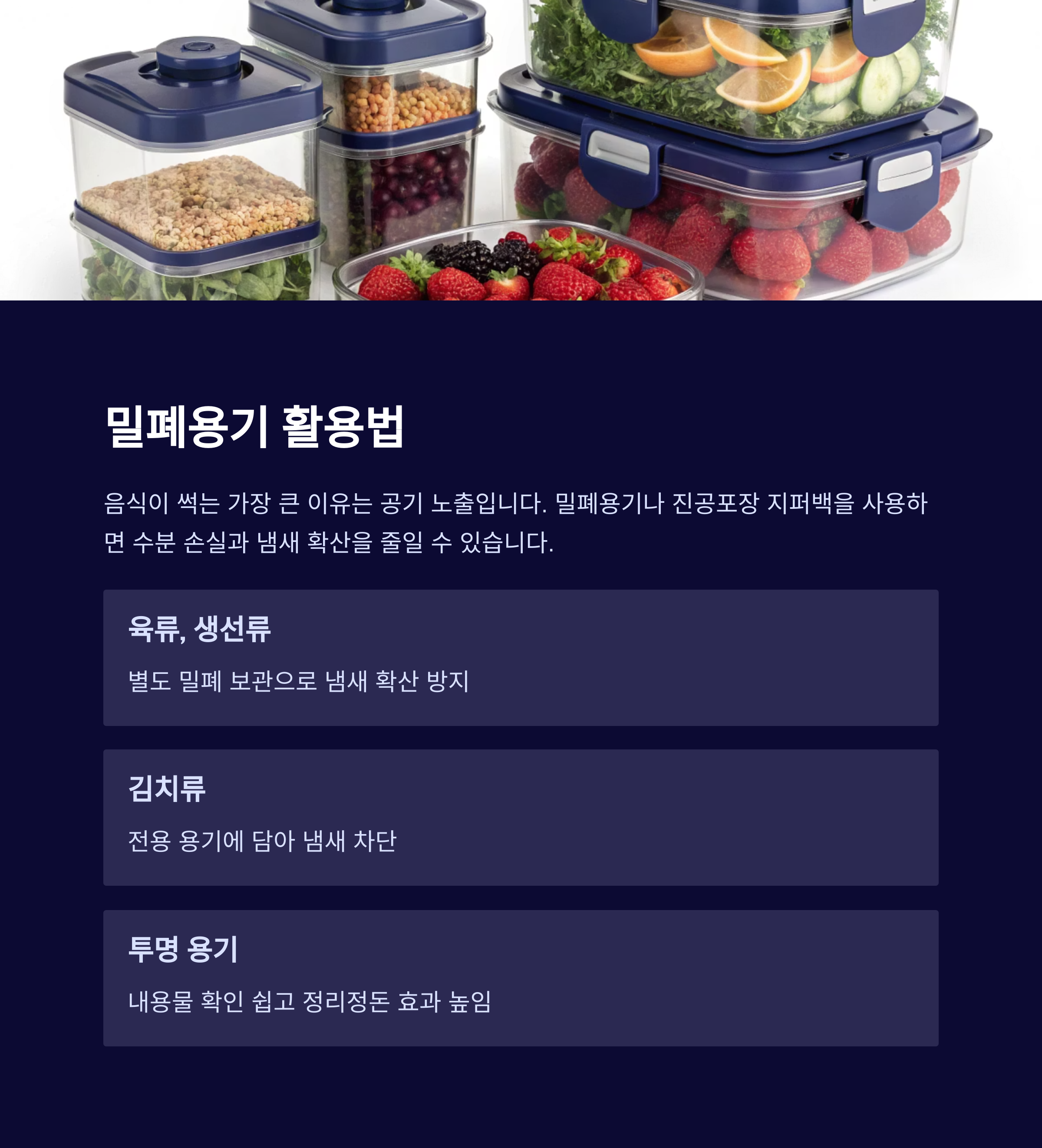 특히 육류, 생선류, 김치 등은 별도 밀폐 보관이 중요합니다