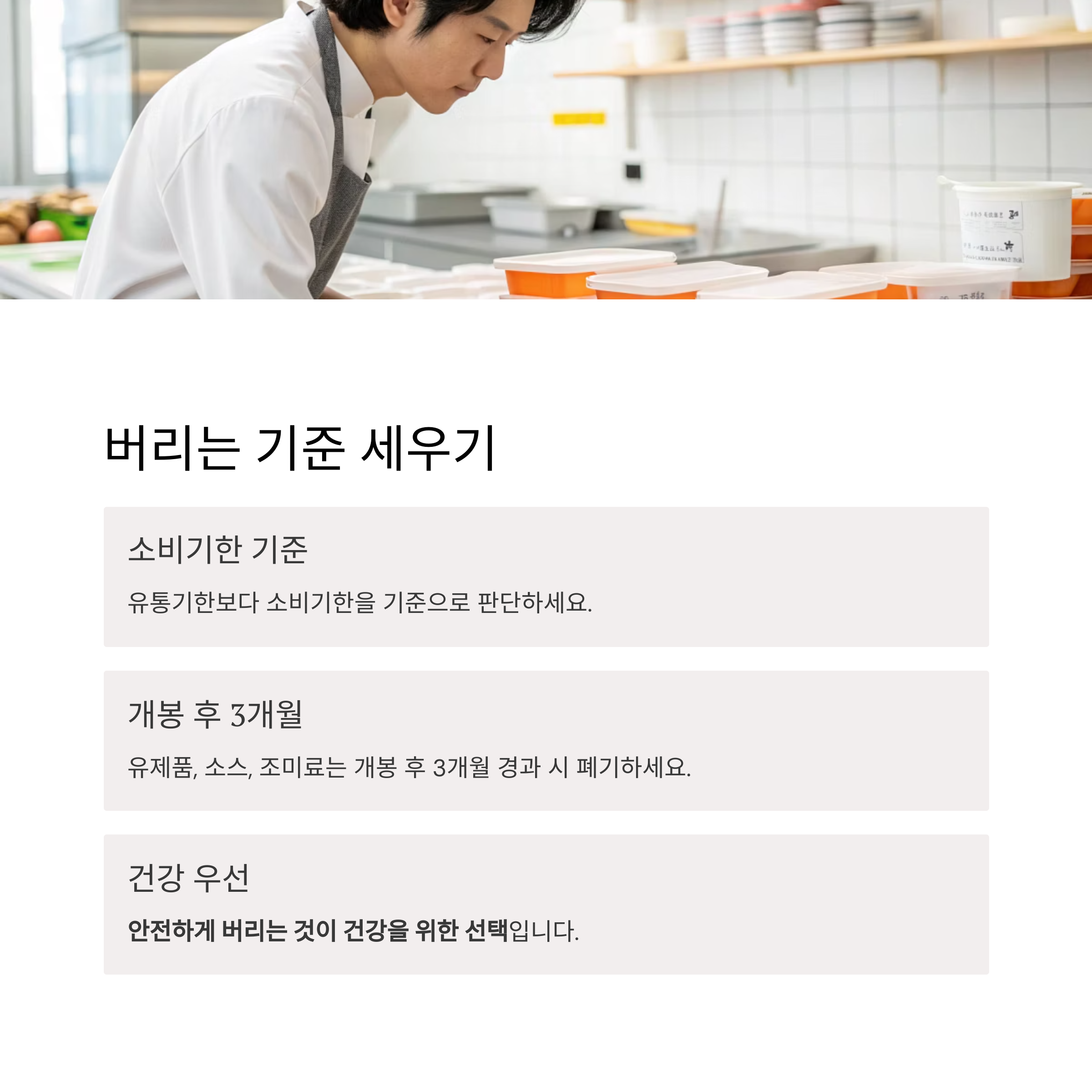 이 단계에서 유통기한이 지난 식품은 과감히 폐기하는 것이 핵심입니다.