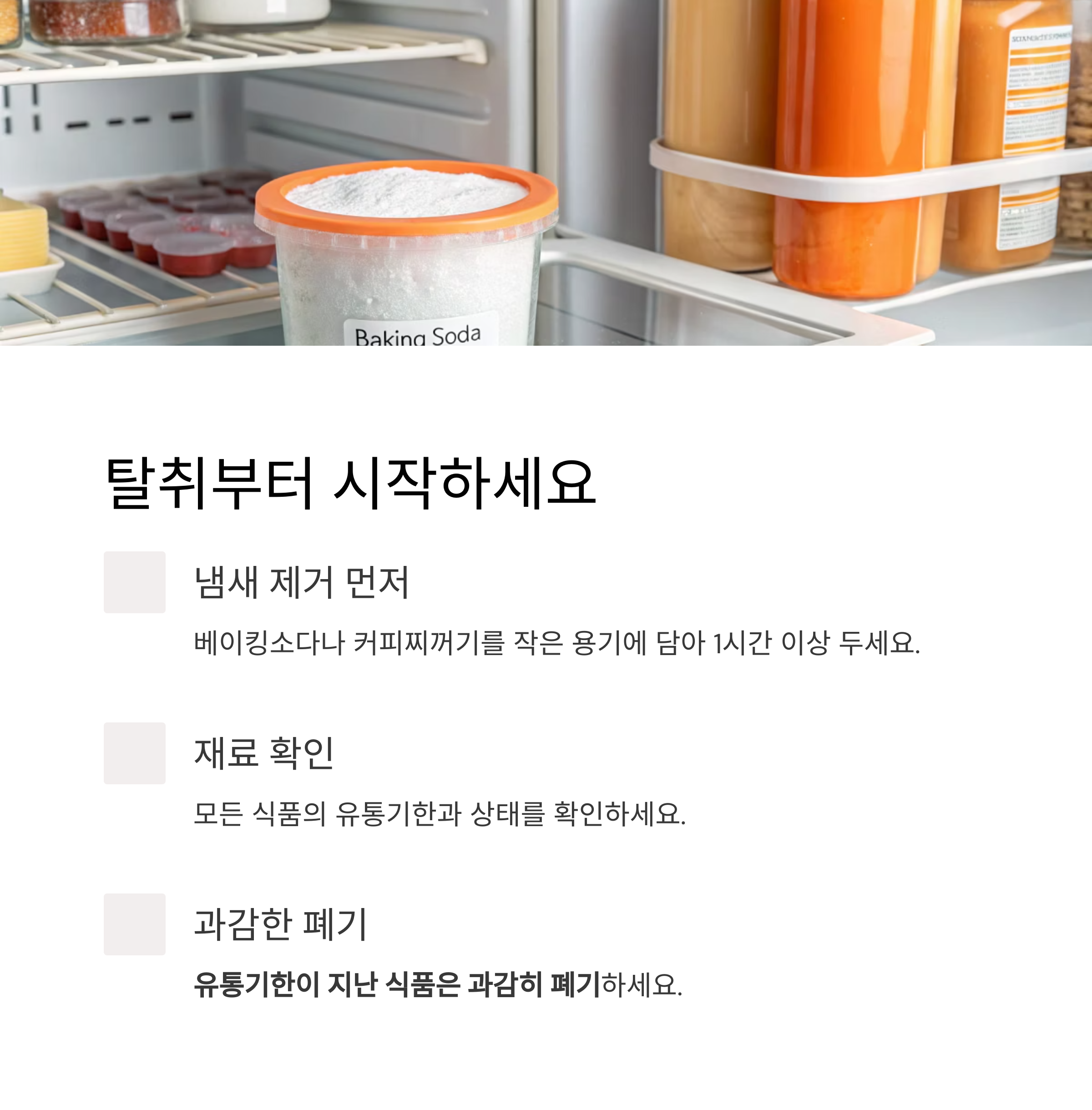 냉장고 속 냄새 제거와 재료 정리는 따로가 아닙니다.