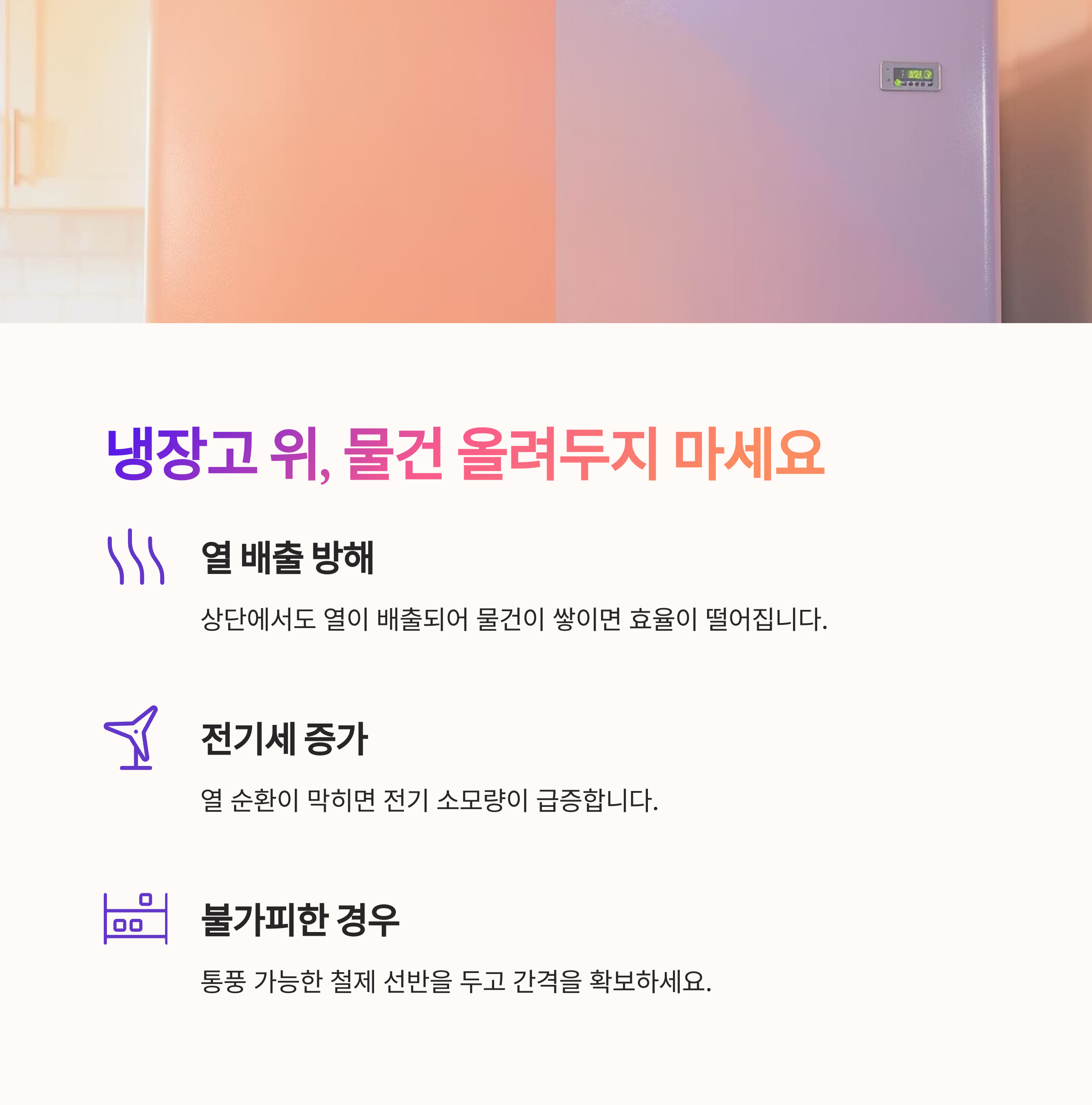 그러나 냉장고는 상단에서도 열을 배출하기 때문에 위에 물건이 쌓이면