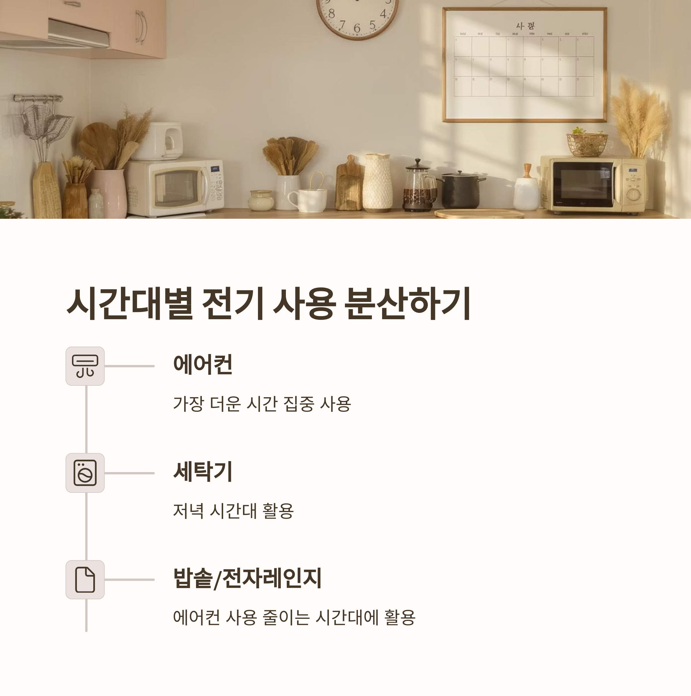 에어컨, 세탁기, 전자레인지, 밥솥 등을 시간차를 두고 사용하는 방식으로 전력 피크를 분산시키면