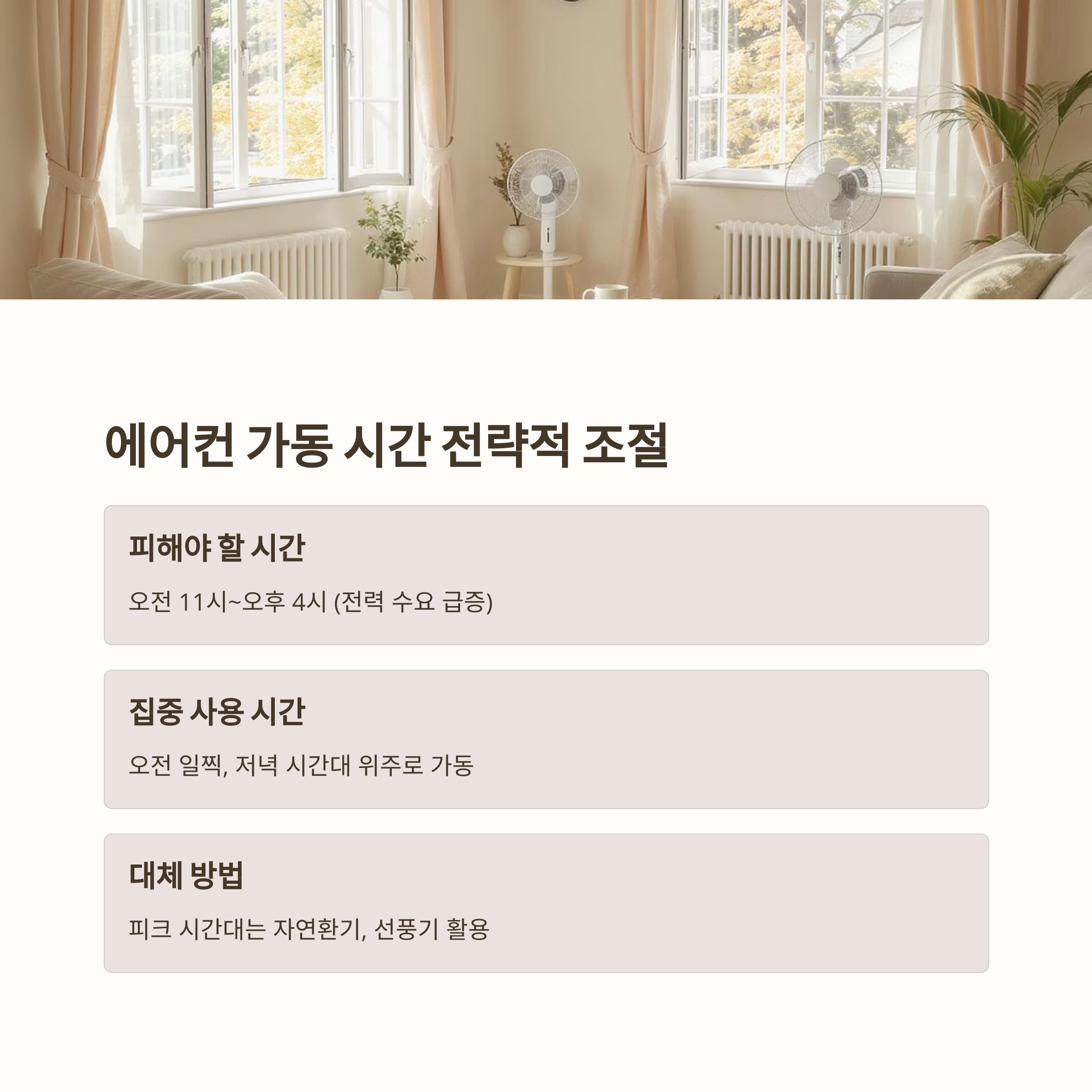 오전 11시부터 오후 4시까지는 전력 수요가 많아 요금이 급증할 수 있으므로, 이 시간대는 자연환기나