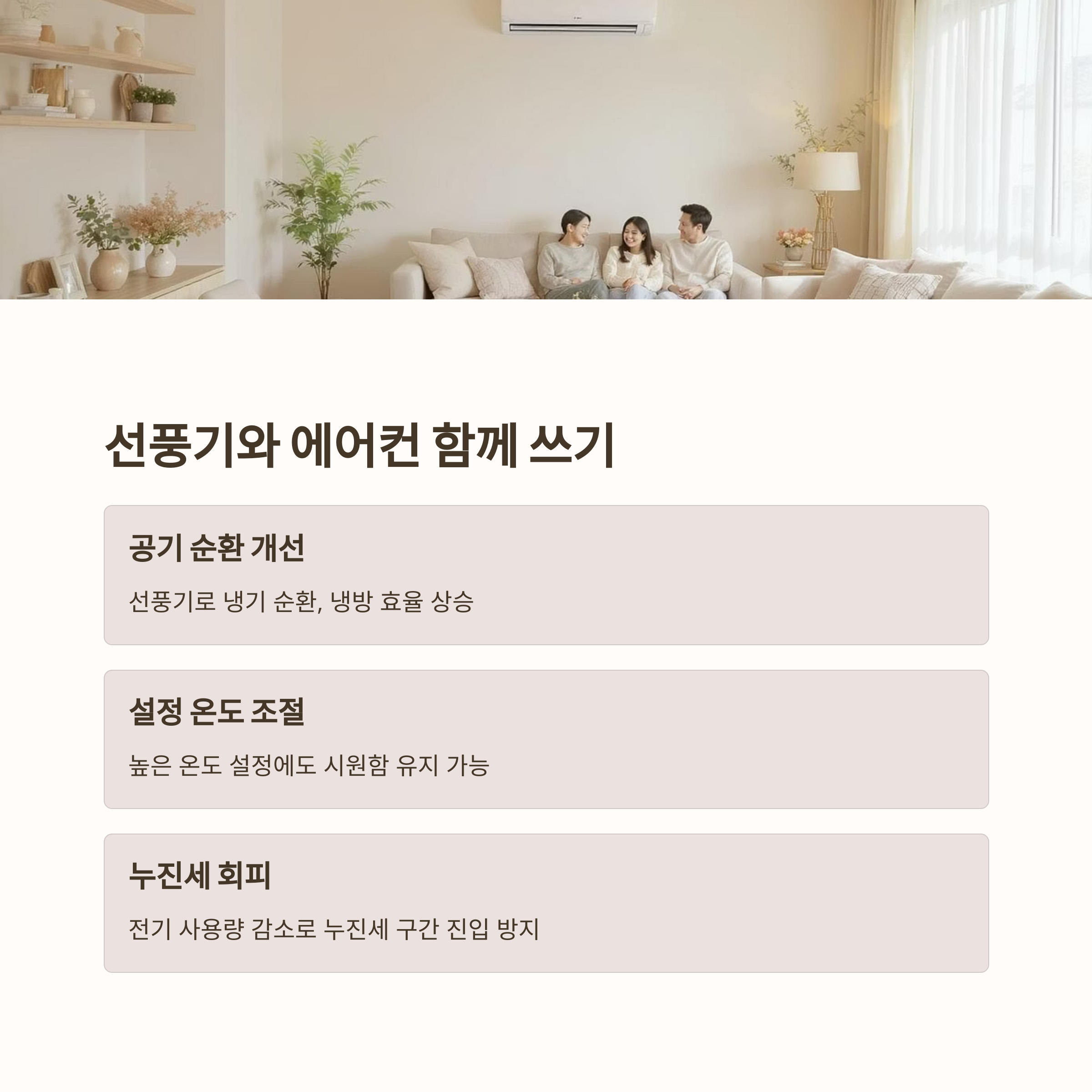 에어컨 단독으로 냉방하는 것보다 선풍기를 함께 사용하면 공기 순환이 원활해져 냉방 효율이 높아집니다.