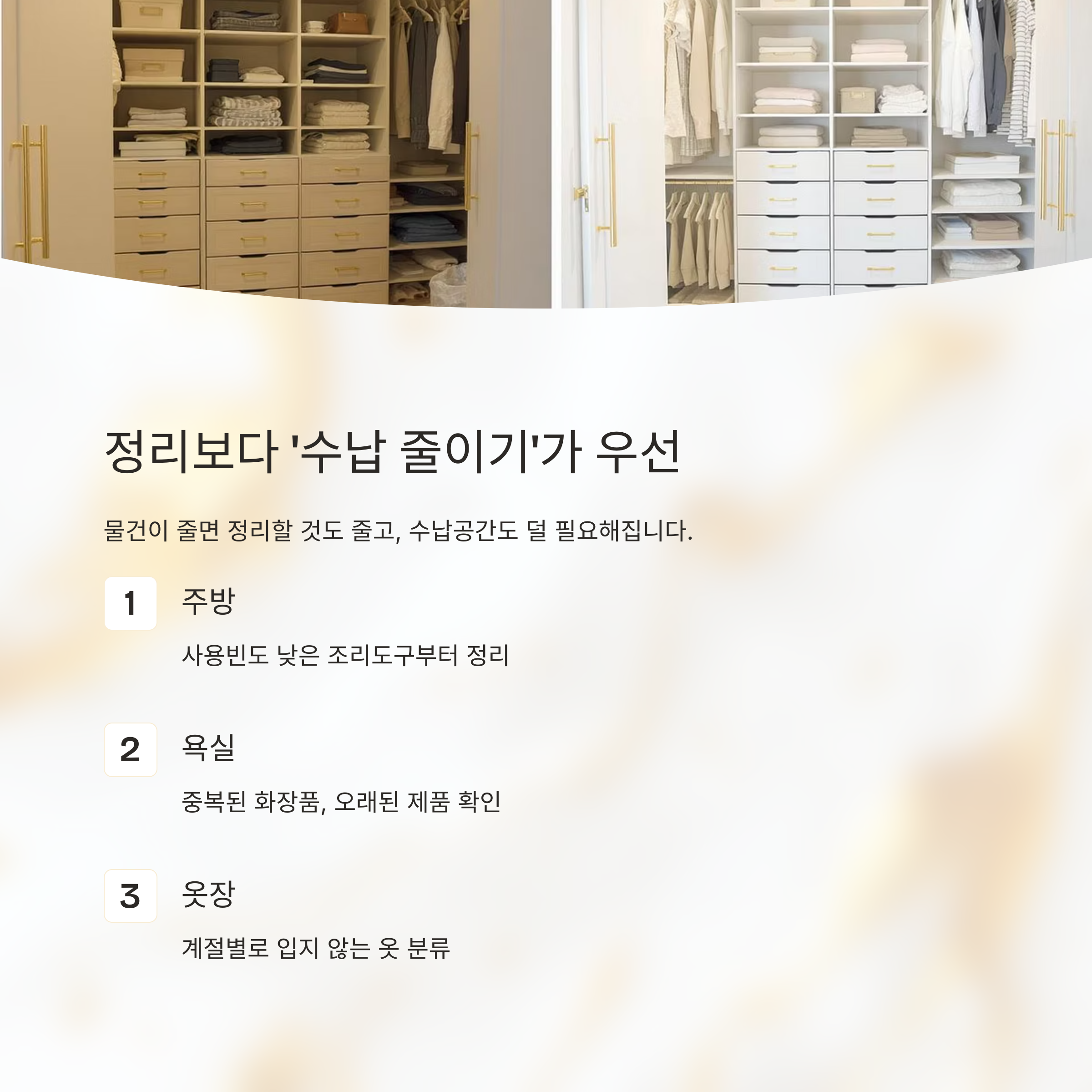 특히 주방, 욕실, 옷장은 사용빈도가 낮은 아이템부터 정리해보는 것이 효과적입니다.