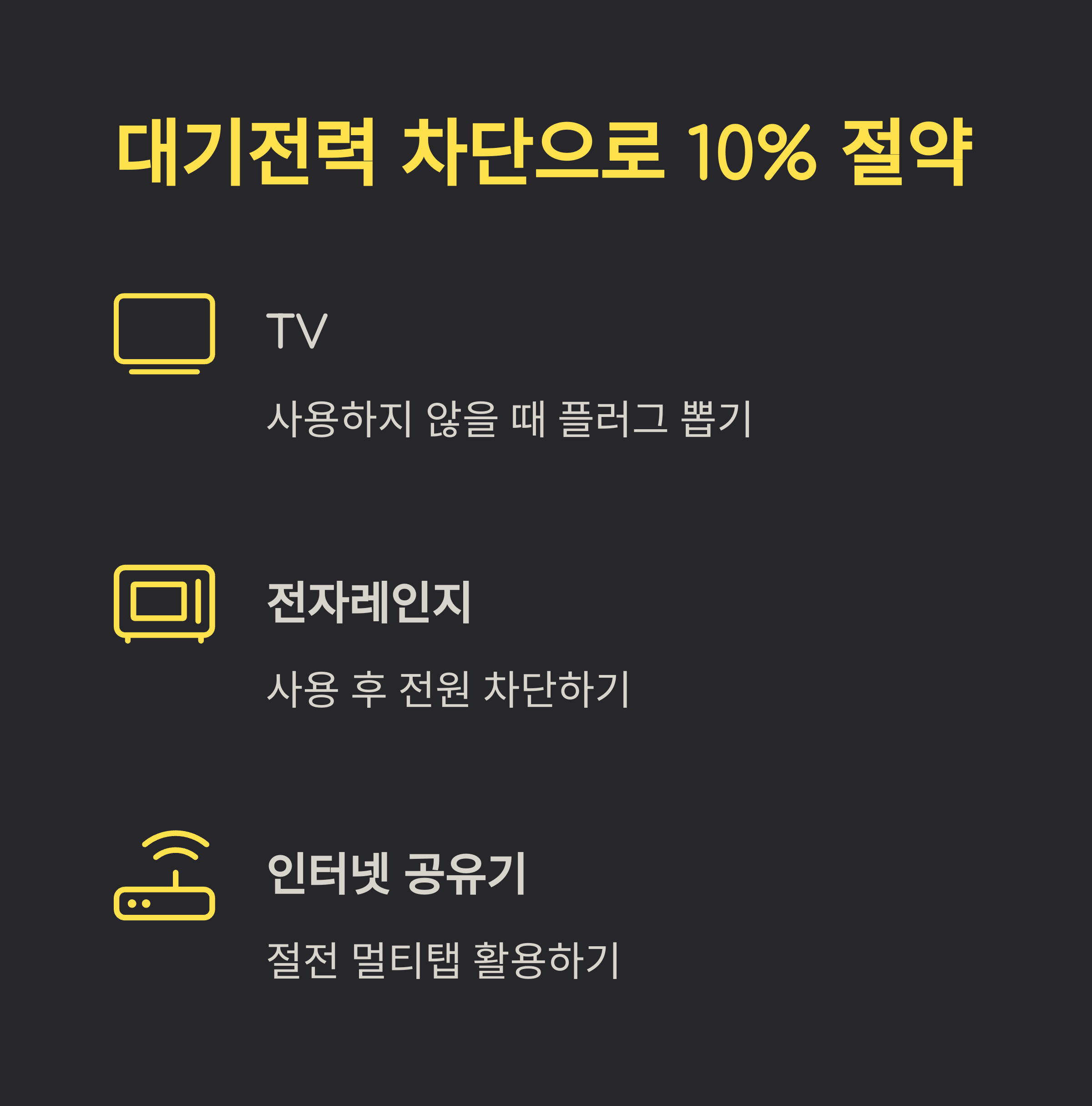 이 대기전력만 잘 차단해도 전체 전력의 10% 이상이 절약됩니다.