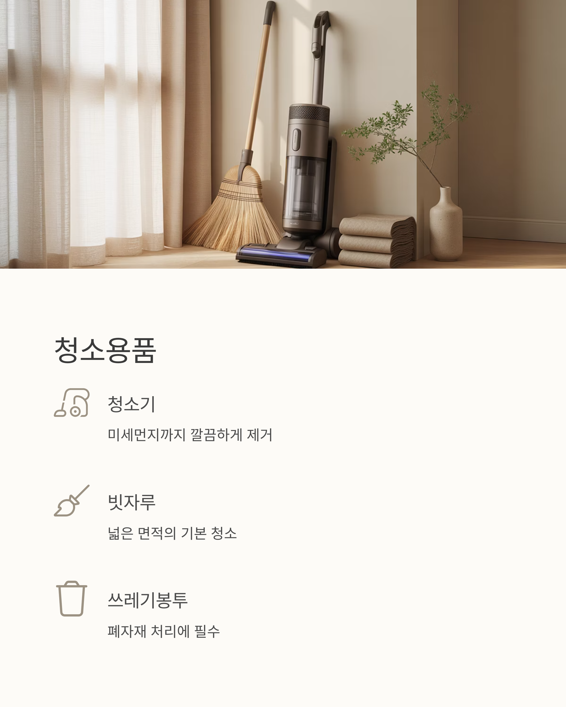 청소용품은 필수입니다. 쓰레기봉투, 빗자루,