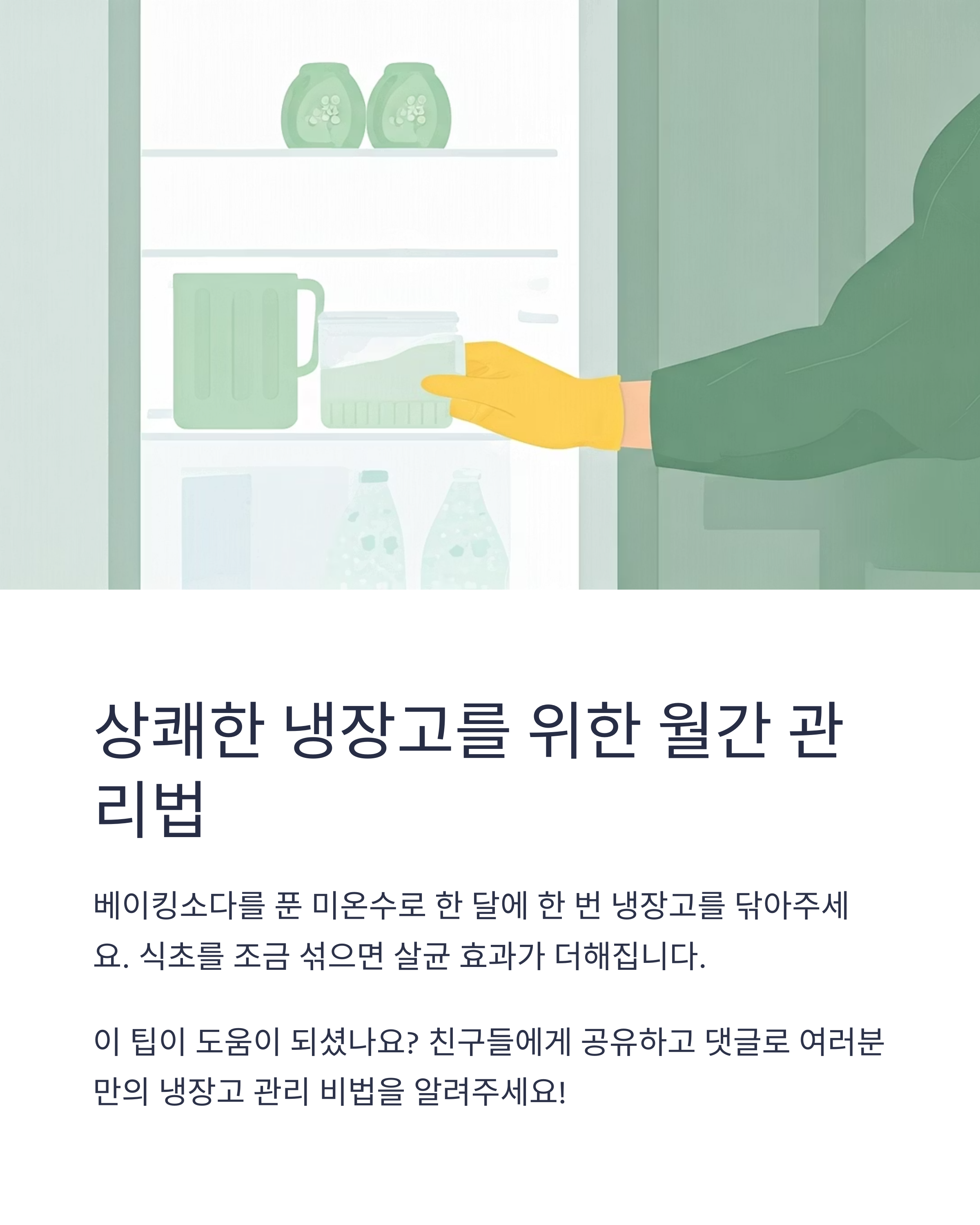 냉장고 청소는 최소 한 달에 한 번, 베이킹소다를 푼 미온수로 닦아주세요.