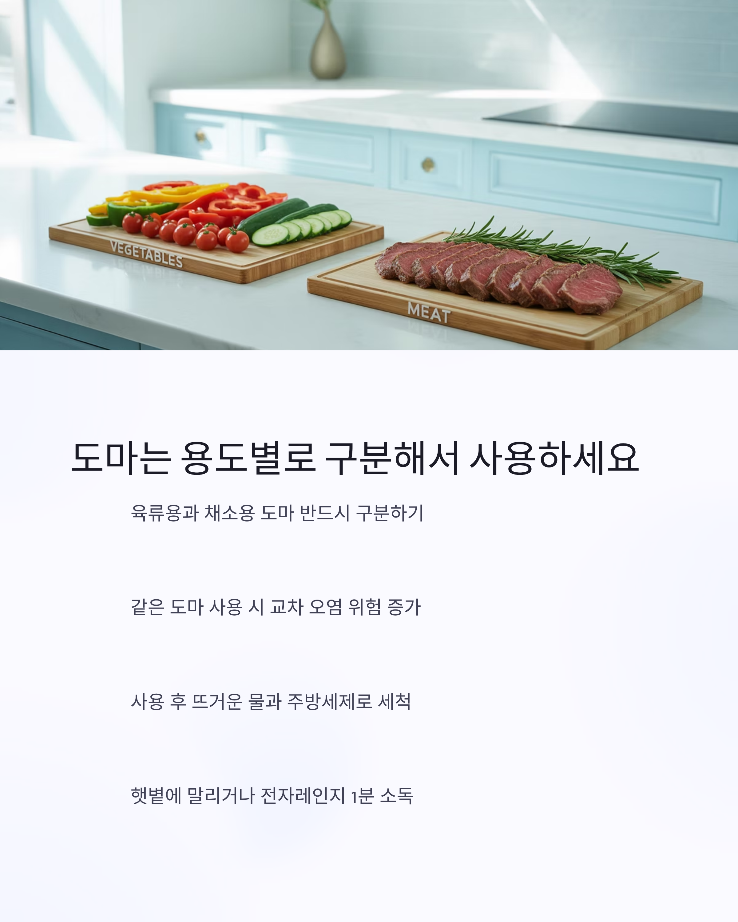 - 육류용 도마와 채소용 도마를 꼭 구분하세요.