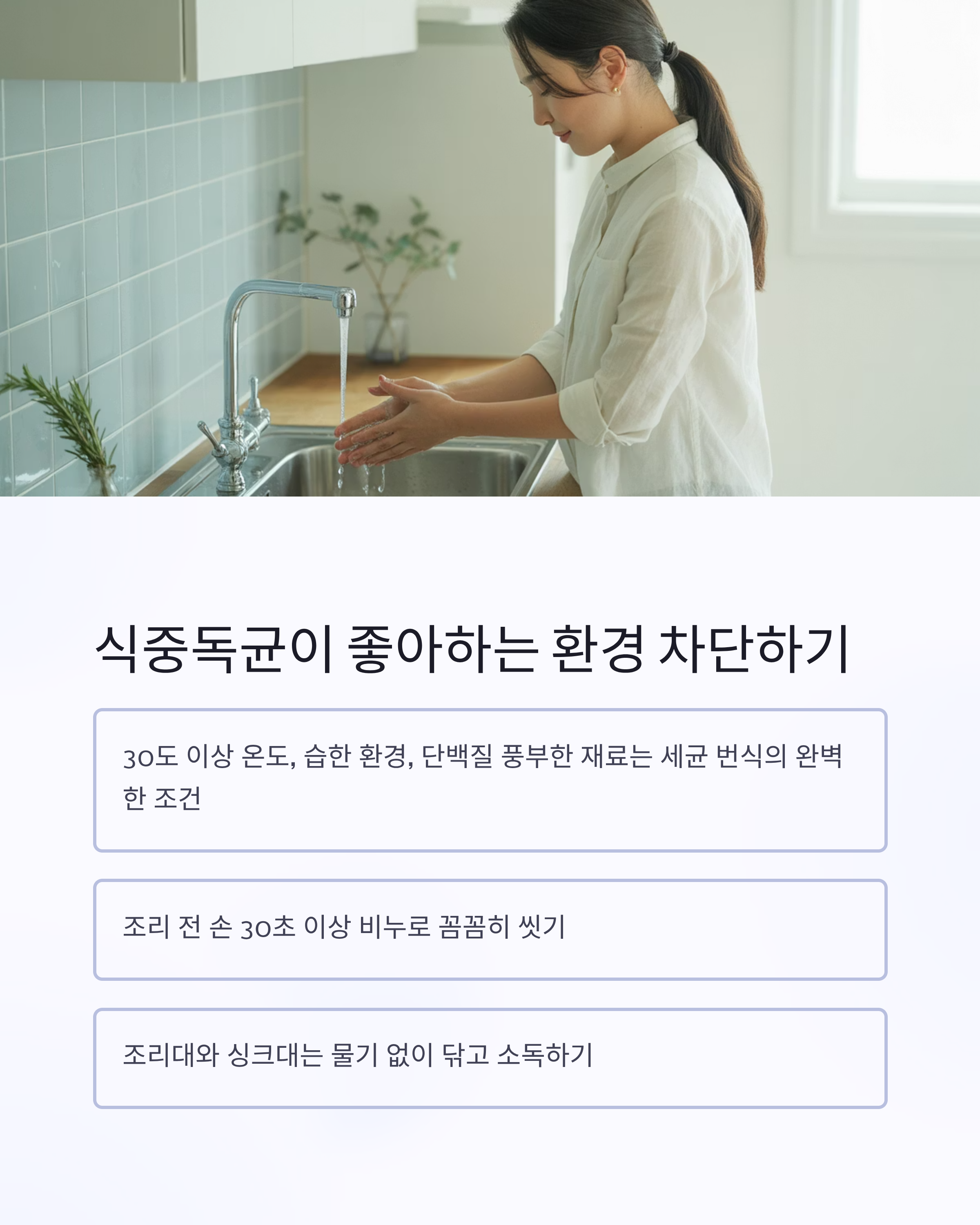 → 세균이 빠르게 번식하는 조건입니다. - 조리 전에는 반드시 손을 30초 이상 비누로 꼼꼼하게 씻고,