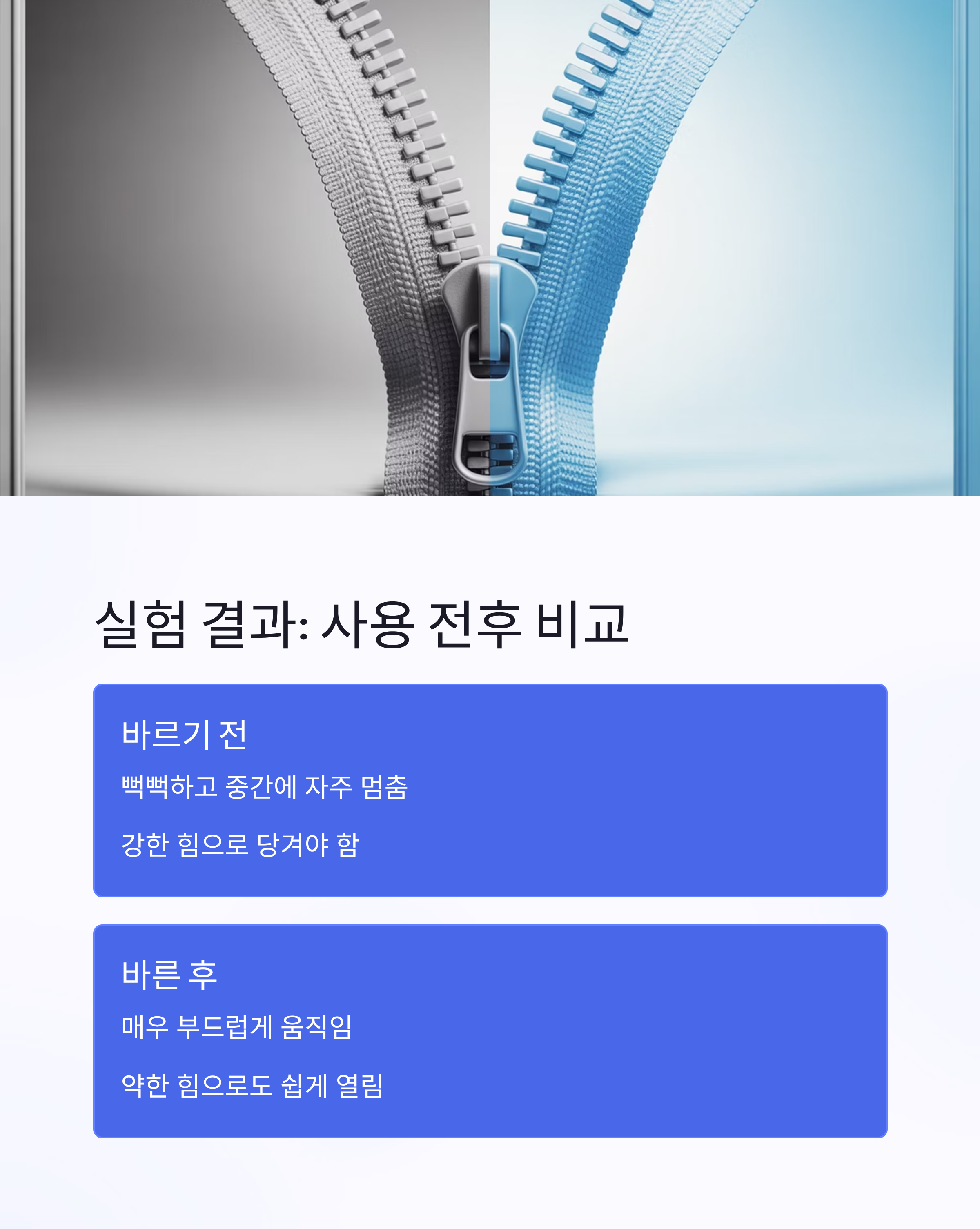 하지만 장기적으로는 지퍼 청소나 전문 윤활제를 병행하는 것이 좋으며,