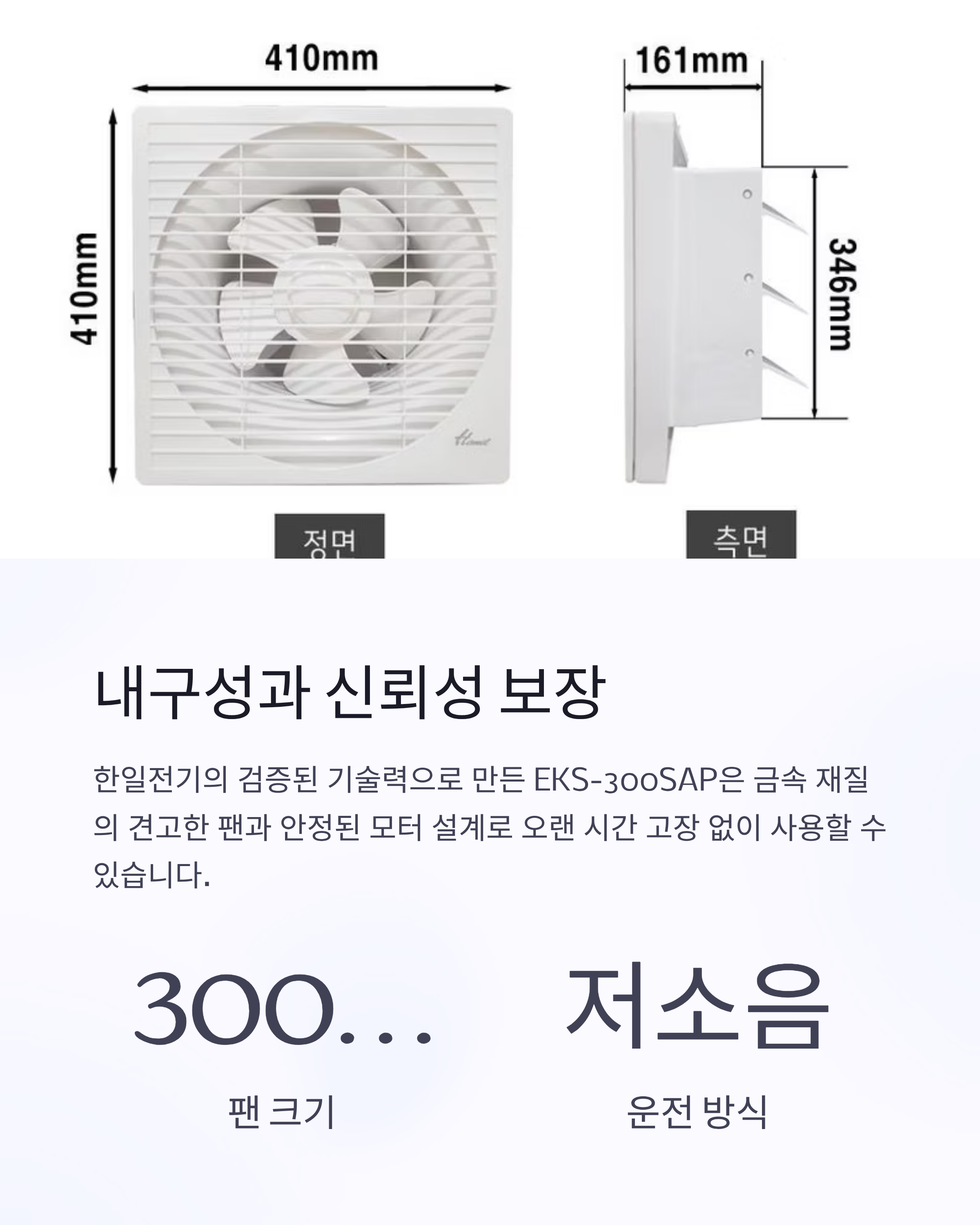 EKS-300SAP은 직경 300mm 팬을 사용하여, 넓은 공간에서도 빠르게 오염된 공기를 배출합니다.
