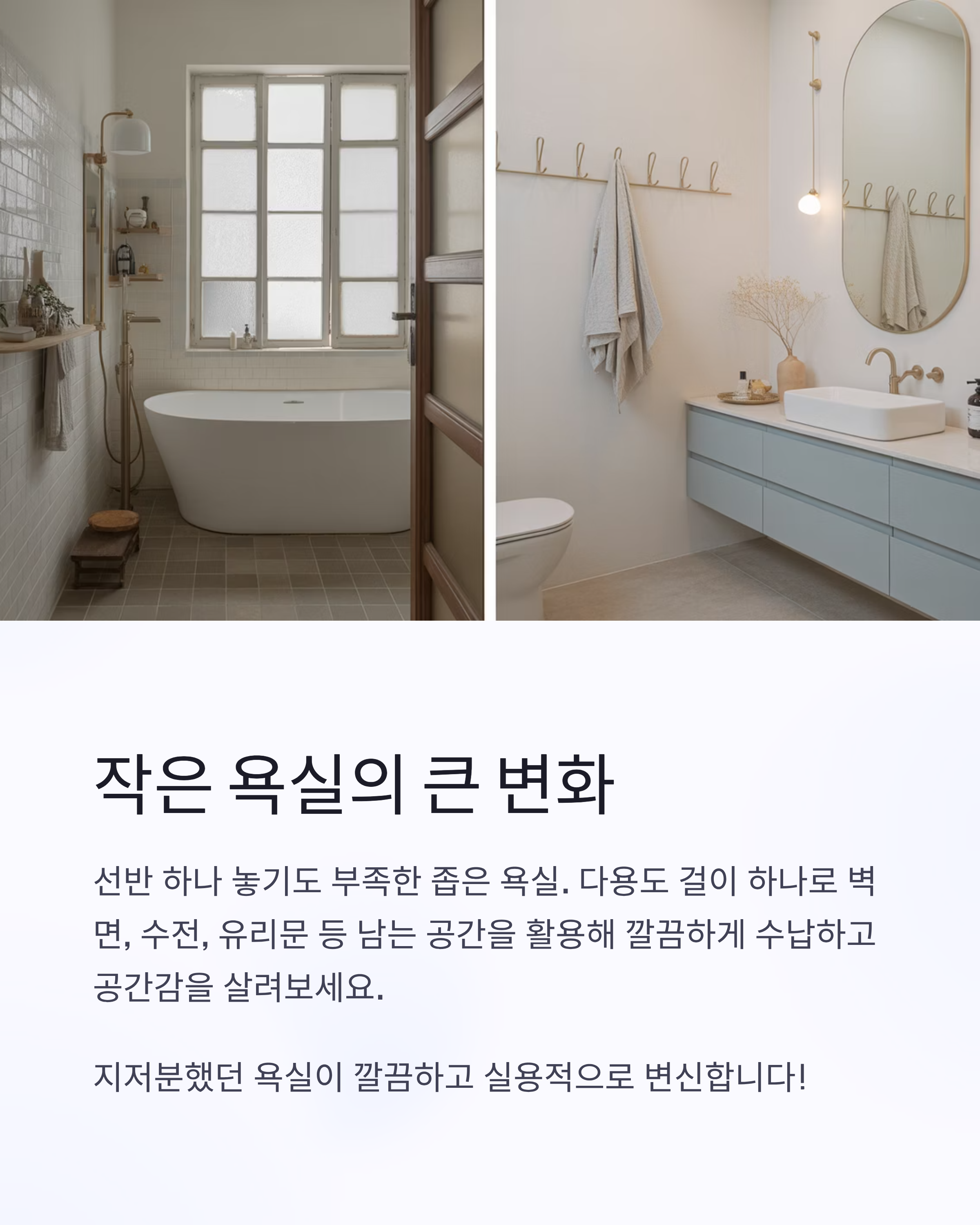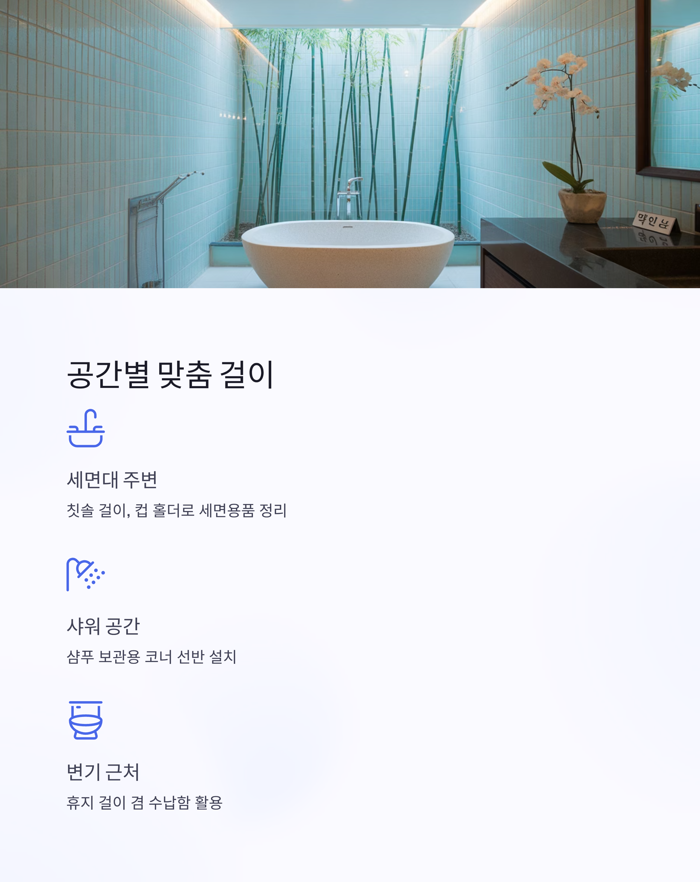 욕실도 구역이 나뉘죠. 세면대 주변, 샤워 공간, 변기 옆 등 각 위치에 맞는 다용도 걸이를 설치하면 훨씬 효율적으로 사용할 수 있어요.