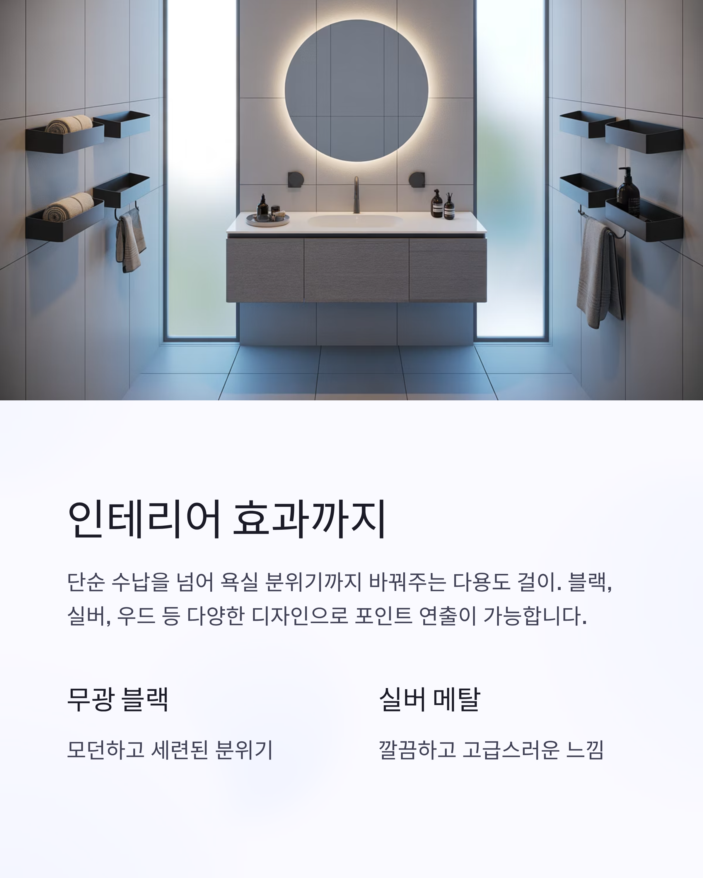 다용도 걸이는 단순히 수납을 위한 도구 그 이상이에요. 블랙, 실버, 우드 등 다양한 컬러와 디자인 덕분에 욕실 인테리어 효과까지 기대할 수 있죠.