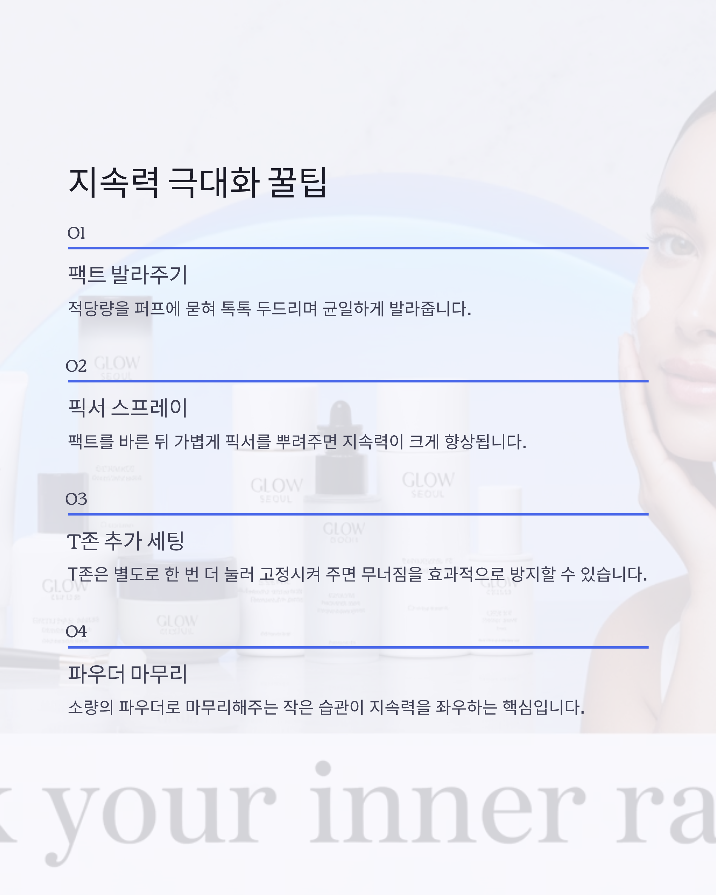 팩트를 바른 뒤 가볍게 픽서를 뿌려주거나, 소량의 파우더로 마무리해주는 것도 지속력을 높이는 데 큰 도움이 돼요.