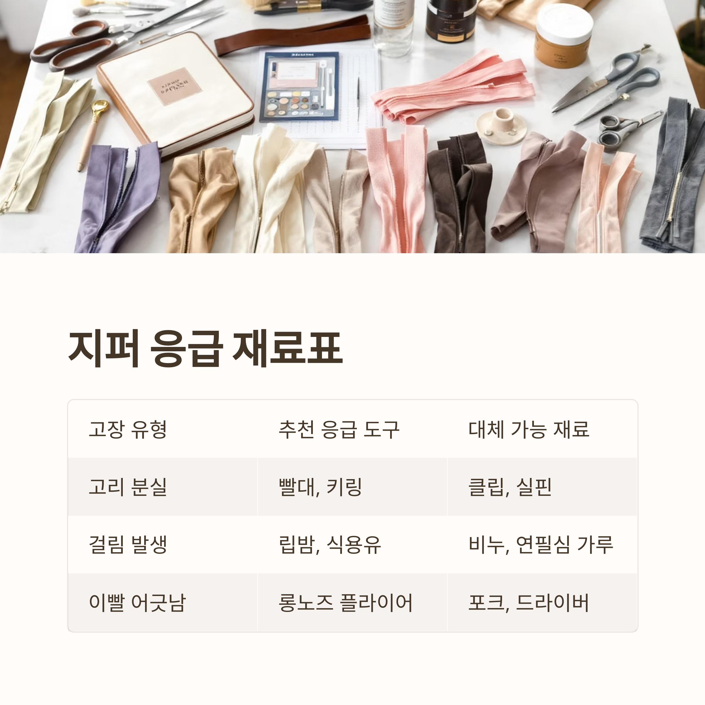 아래 표는 지퍼 고장 시 유용하게 쓸 수 있는 재료입니다.