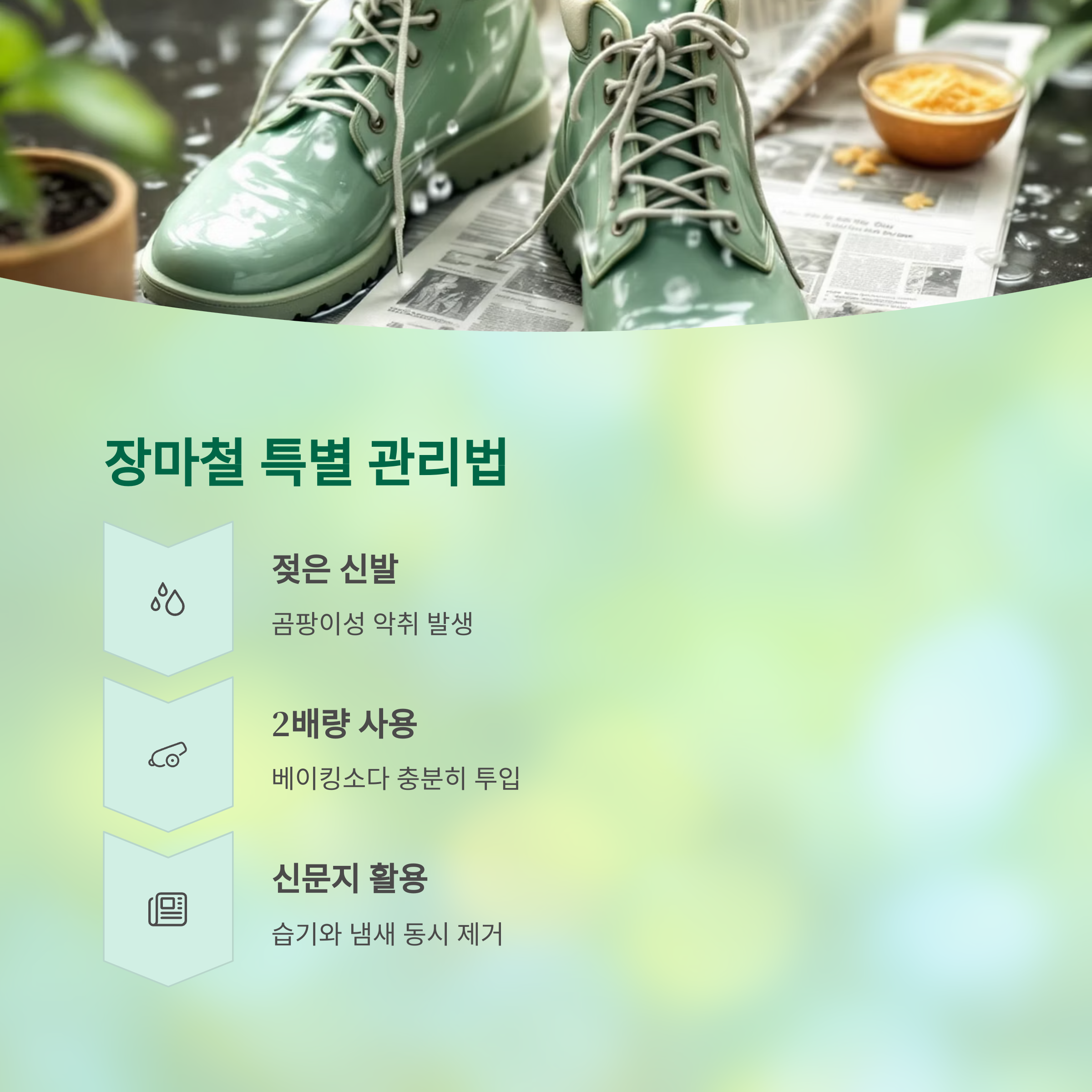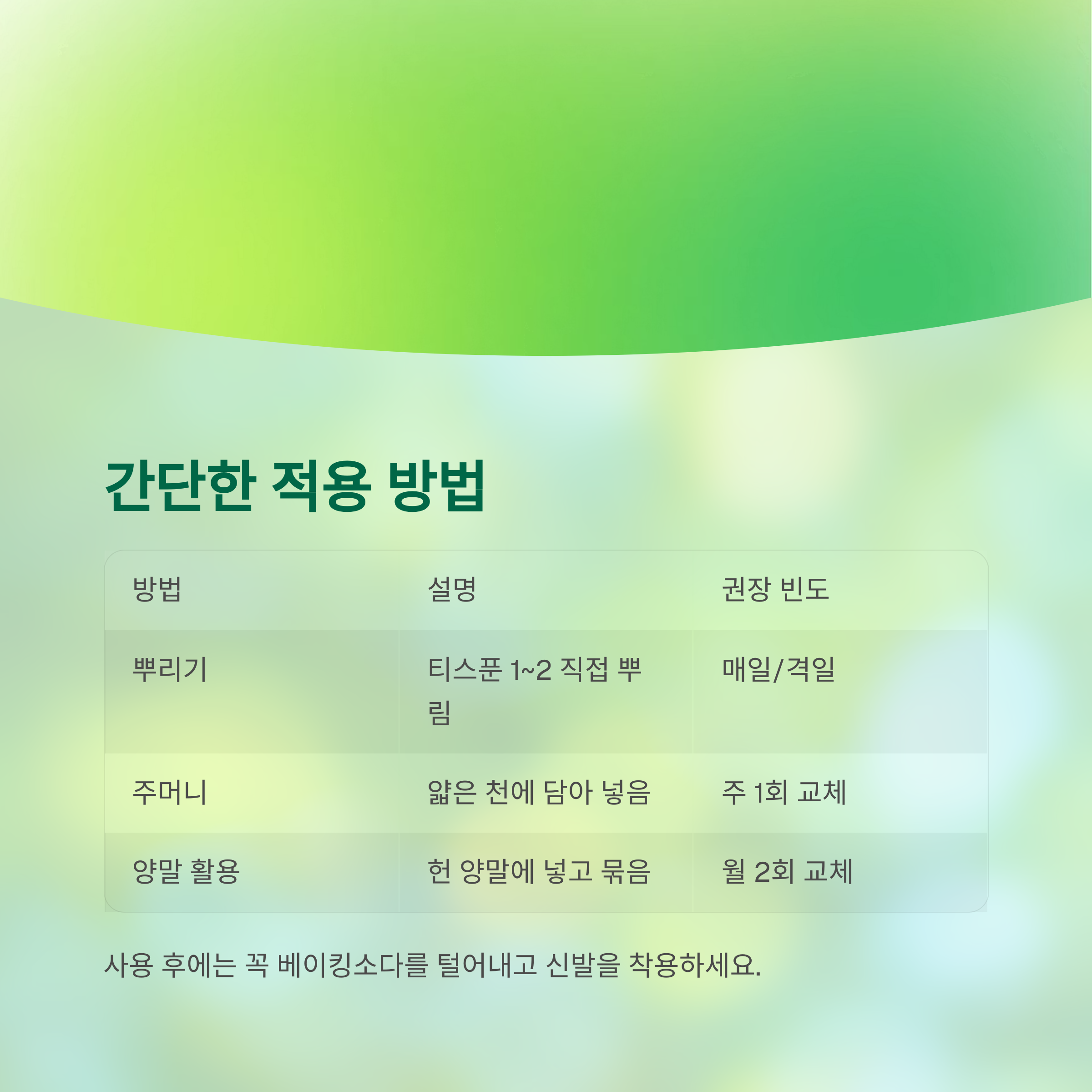 | 뿌리기 | 신발 속에 티스푼 1~2 베이킹소다를 직접 뿌림 | 매일 또는 격일 |