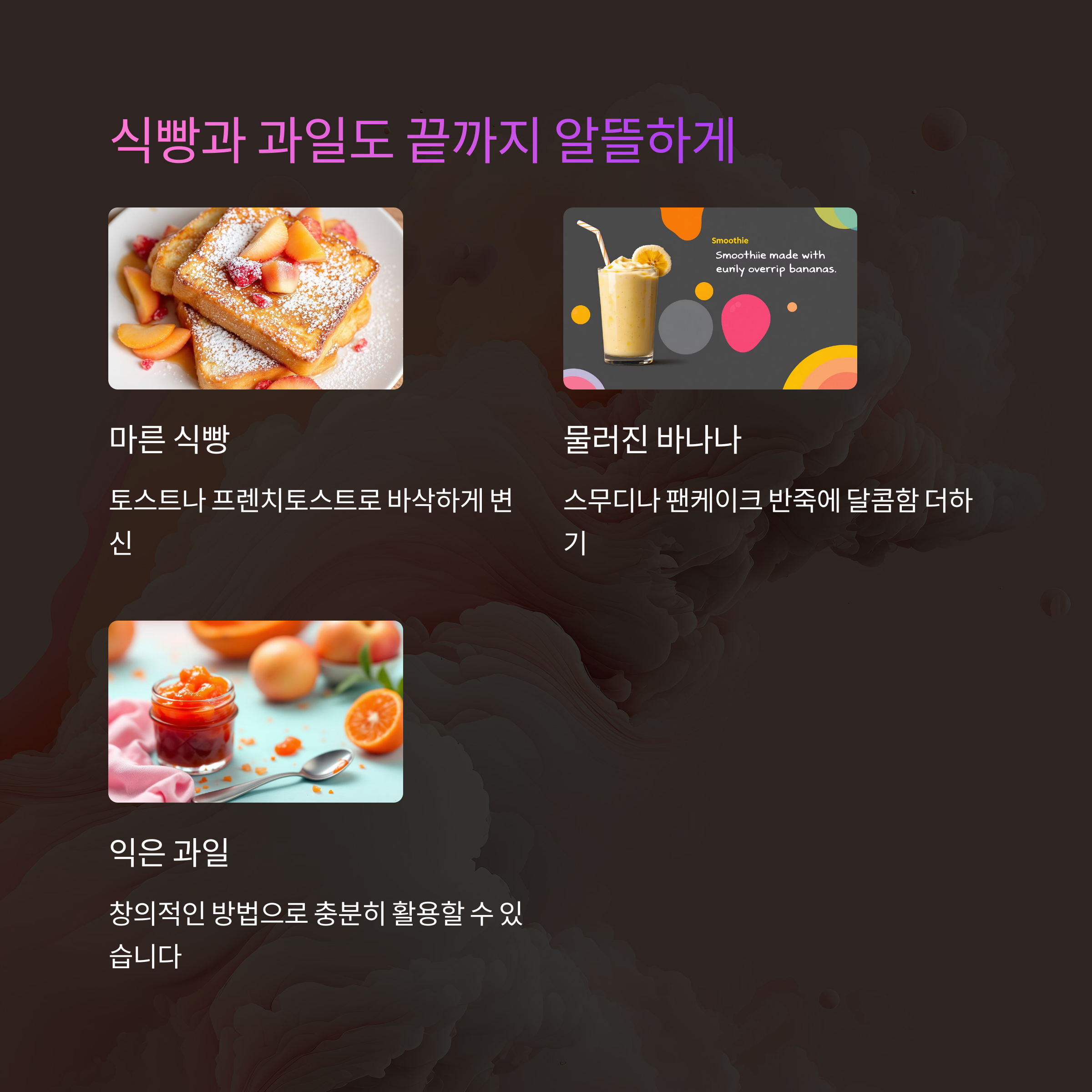 | 식빵 | 프렌치토스트, 크루통 | 바삭하게 변신 가능 |
