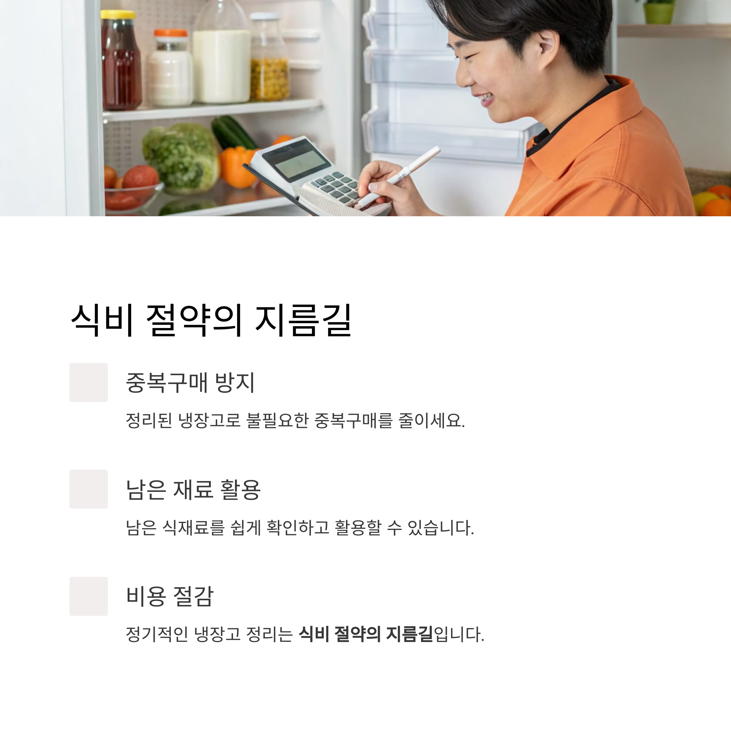 시간은 절약하고, 위생은 챙기며, 효율적인 냉장고 사용을 도와드립니다.