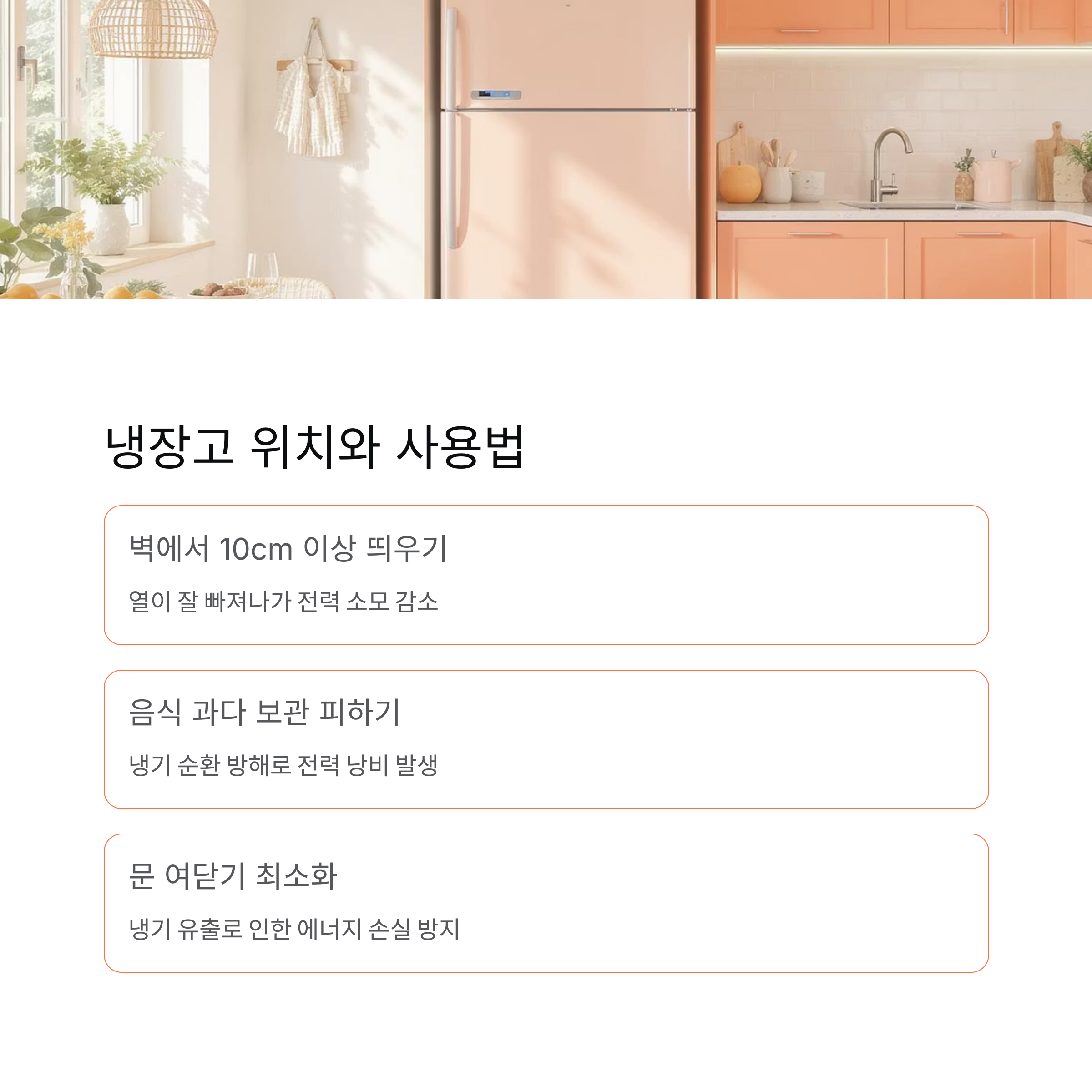 냉장고는 24시간 작동하기 때문에 효율적인 위치에 두는 것이 중요합니다.