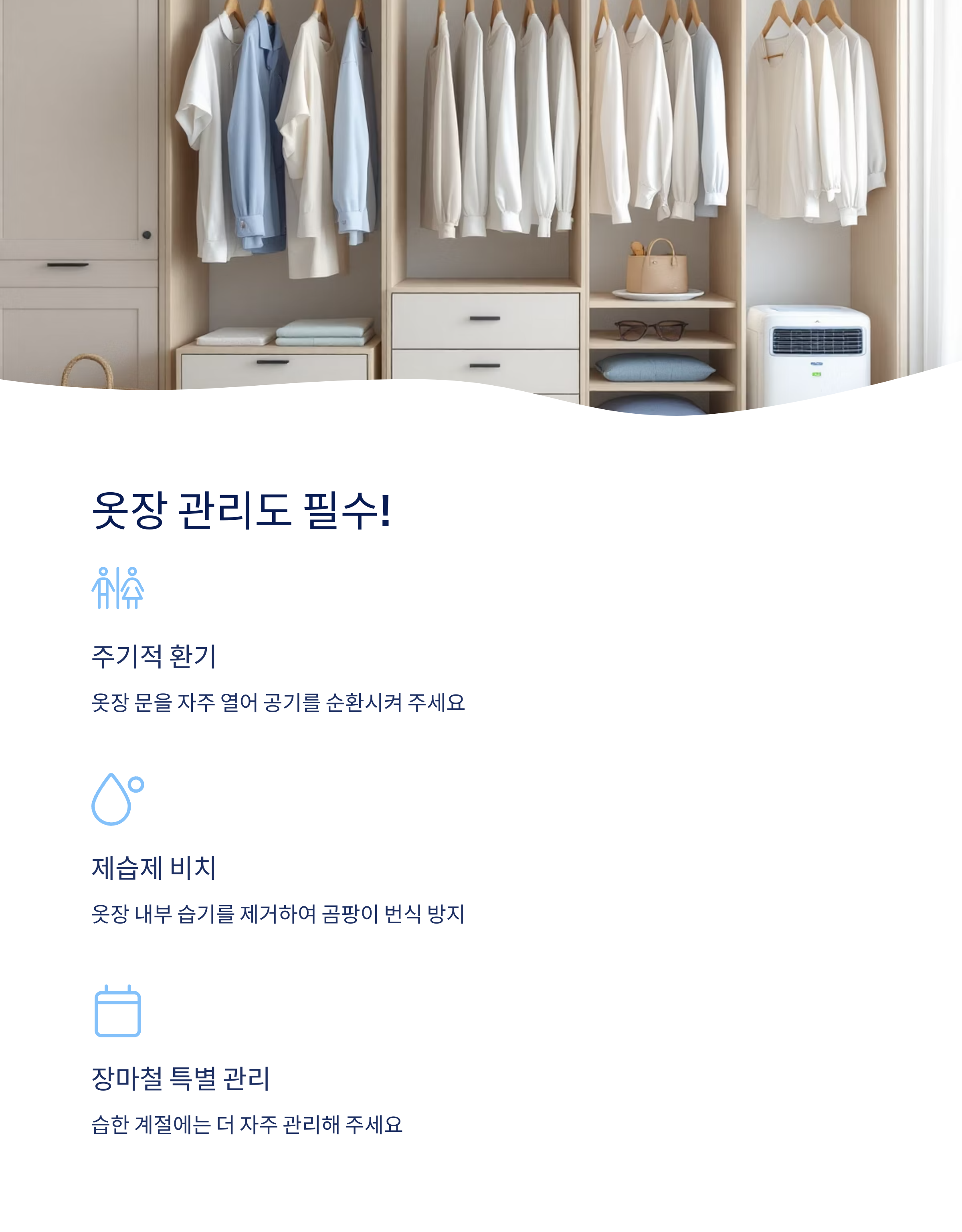 주기적으로 문을 열어 환기를 시켜주세요. 장마철에는