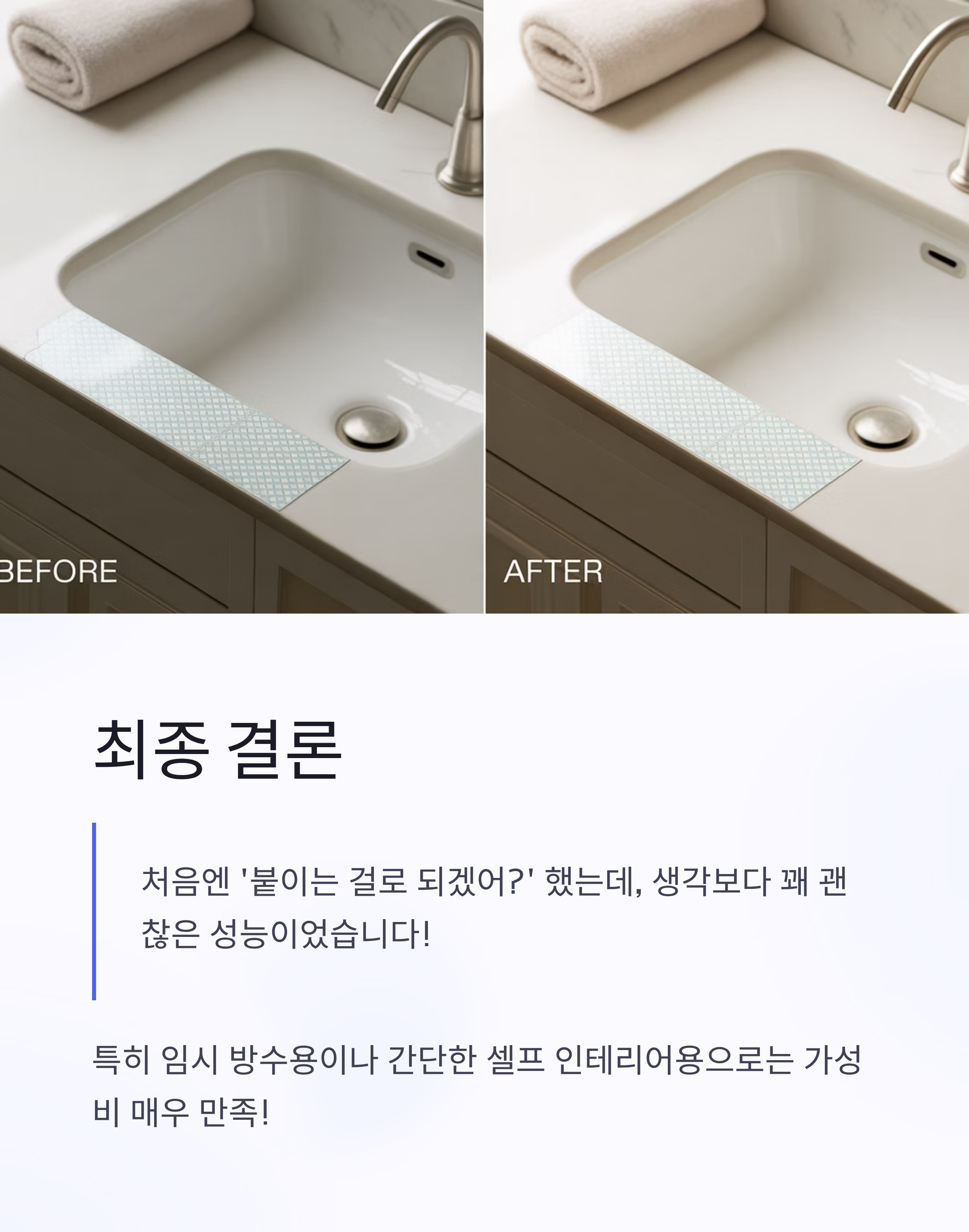 | ✅ 시공 없이 간단 부착 | ❌ 실리콘 위엔 접착 약함 |